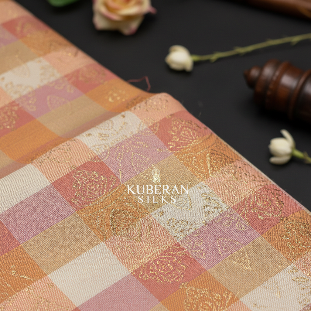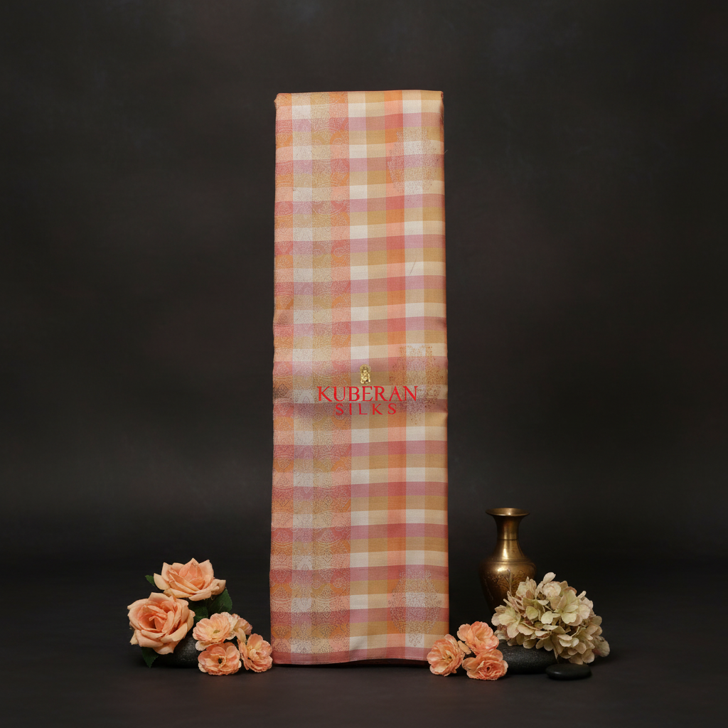 Kuberan Peach Checkered Kanchipuram Silk Saree