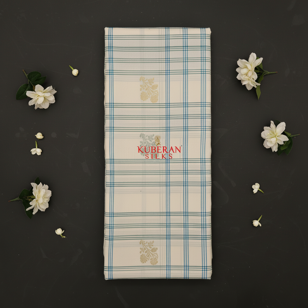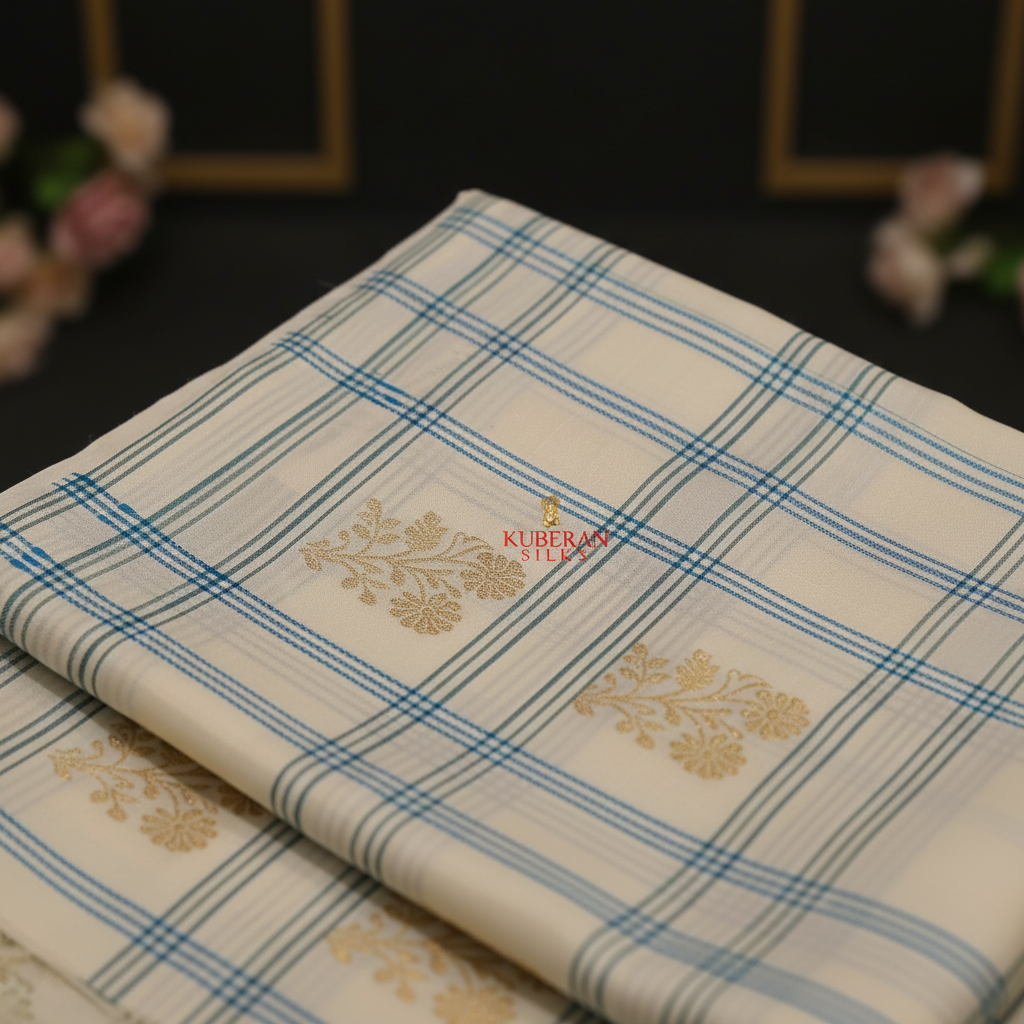 Kuberan Cream Blue Checkered Kanchipuram Silk Saree