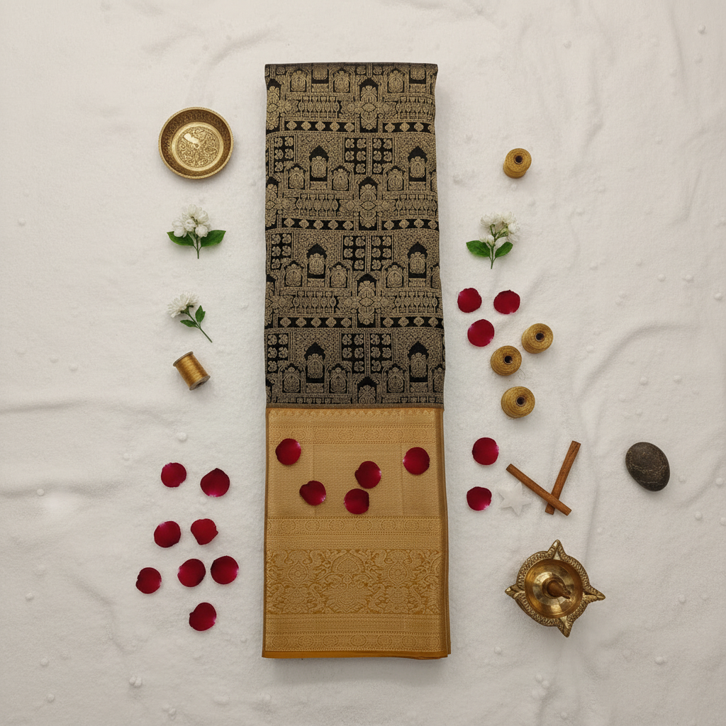 kuberan Black with Golden Temple Motifs Kanchipuram Silk Saree