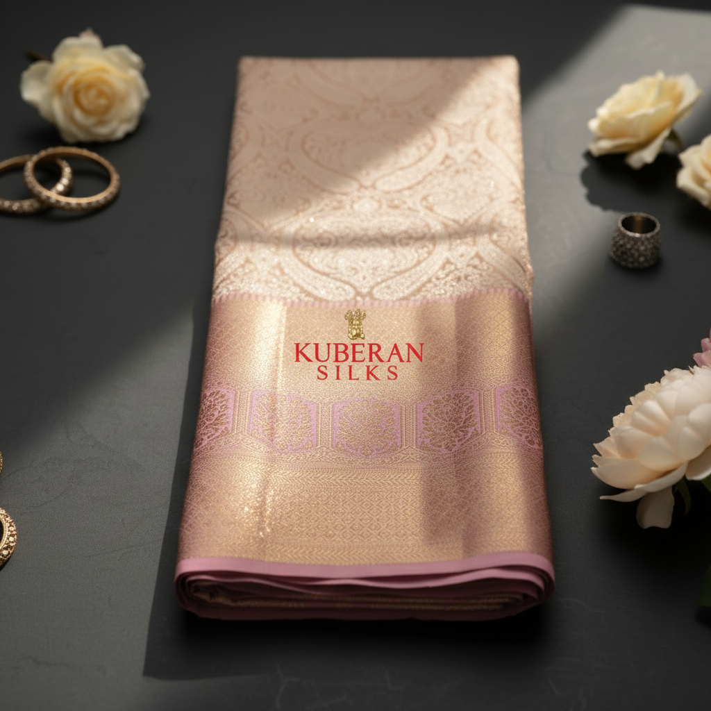 Kuberan Gold Pink Border Kanchipuram Silk Saree