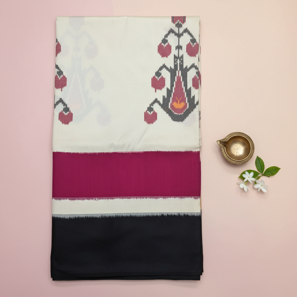 Kuberan Off White with Magenta and Black Border Premium Ikat Silk Saree
