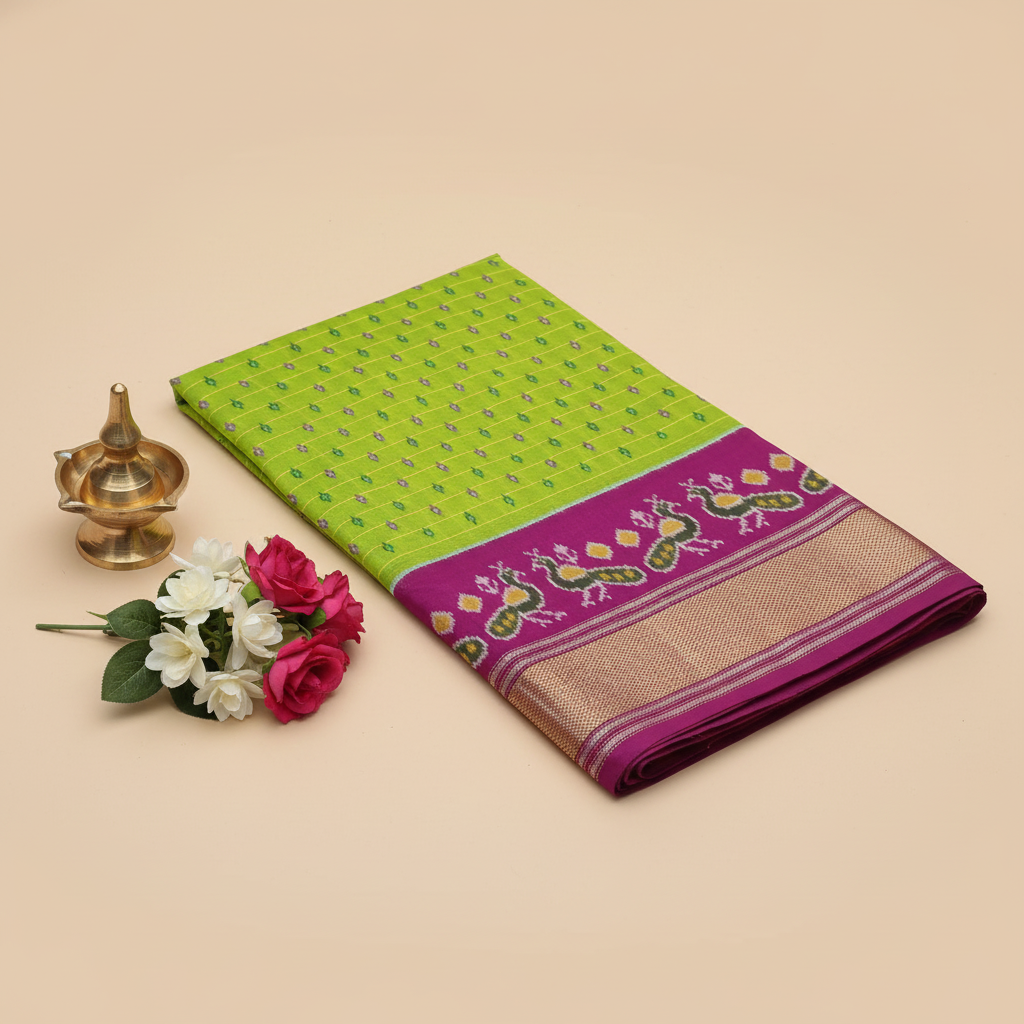 Parrot Green with Magenta Border Ikat Silk Saree