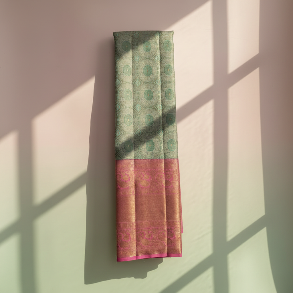 Kuberan Green Pink Border Kanchipuram Silk Saree