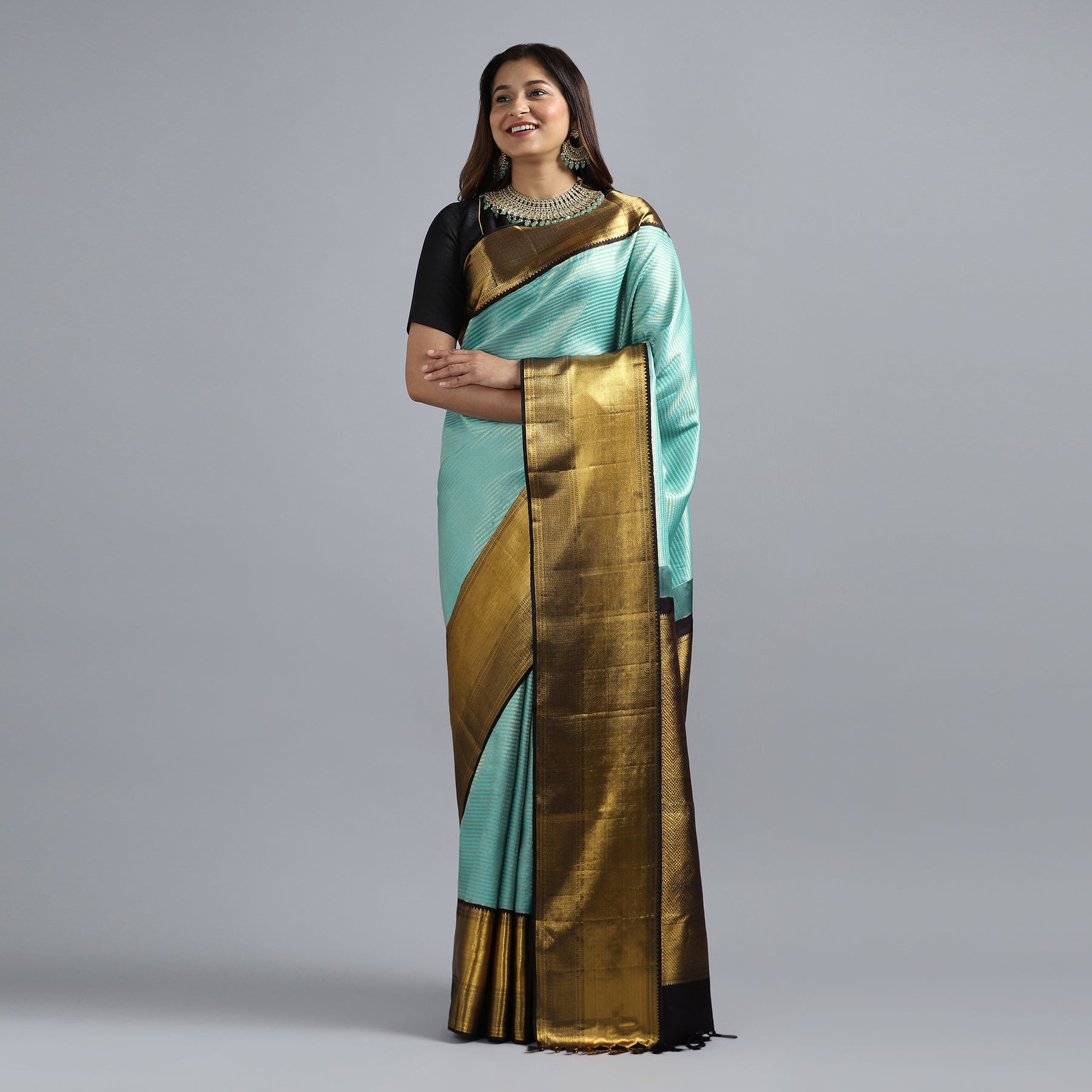 This gorgeous KUBERAN BLUE WITH BLACK KANCHIVARAM SAREE is a stunning addition to any wardrobe! Crafted with a unique designer ZARI WORK, the saree ensures a one-of-a-kind look. Showcase your stylish side with this beautiful saree!