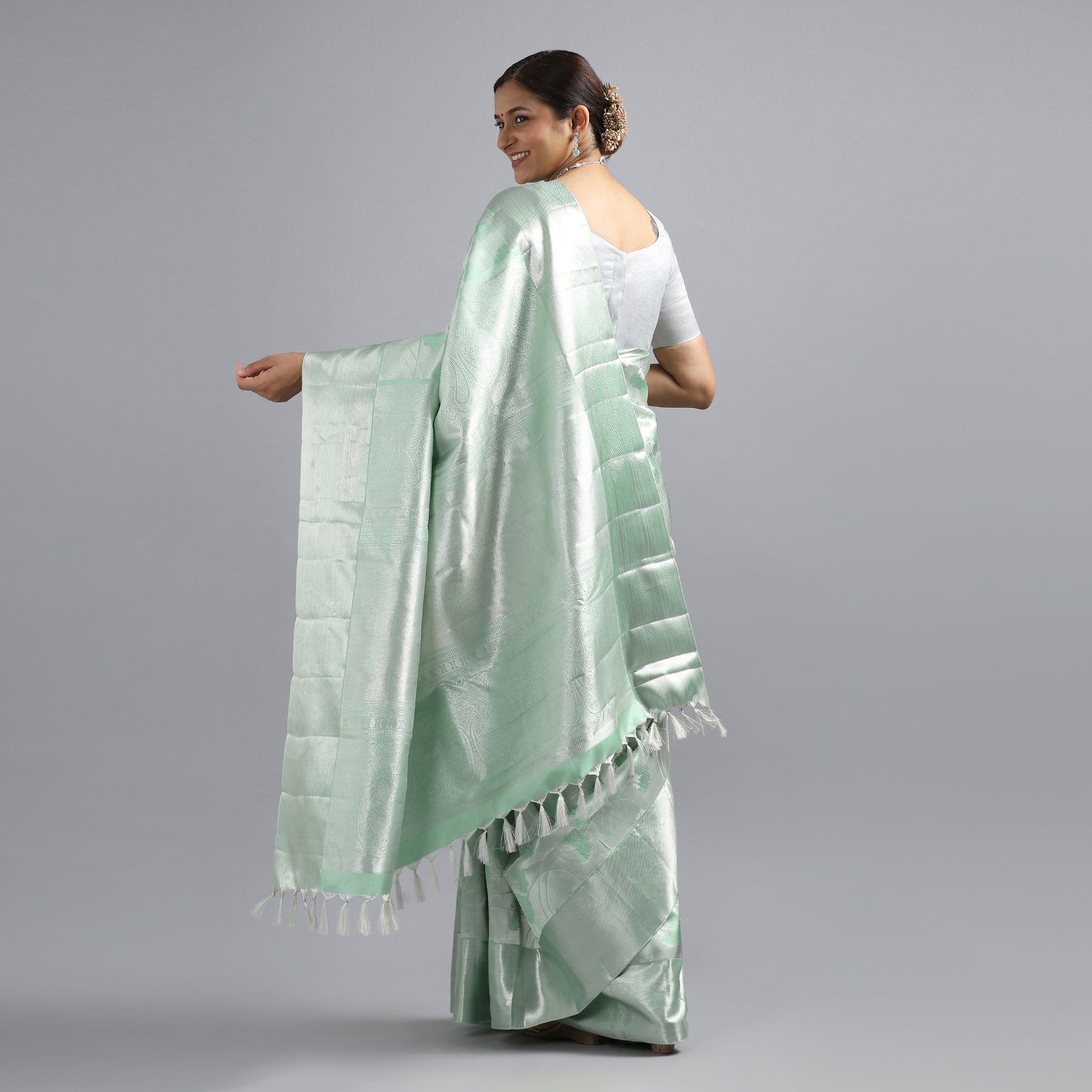 Look stunningly beautiful in this unique Kuberan Pista green Kanchivaram saree, crafted with delicate silver zari work. Perfect for special occasions, this saree features intricate detail and is sure to make a lasting impression.