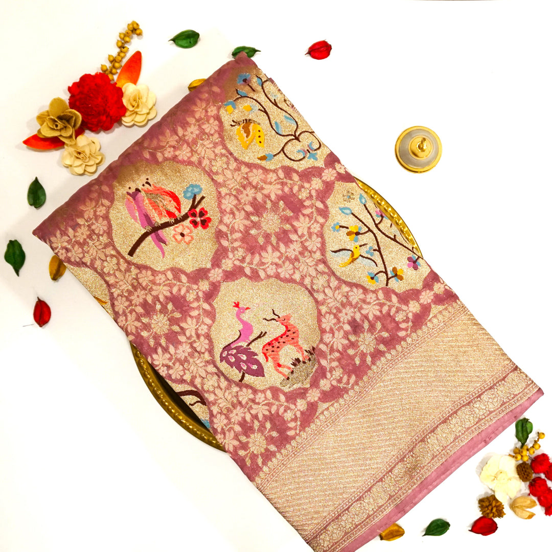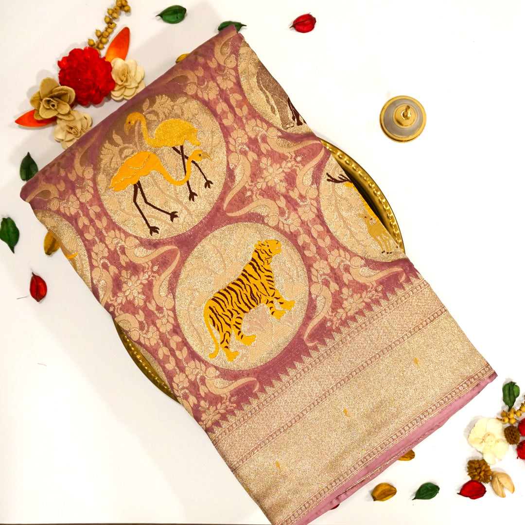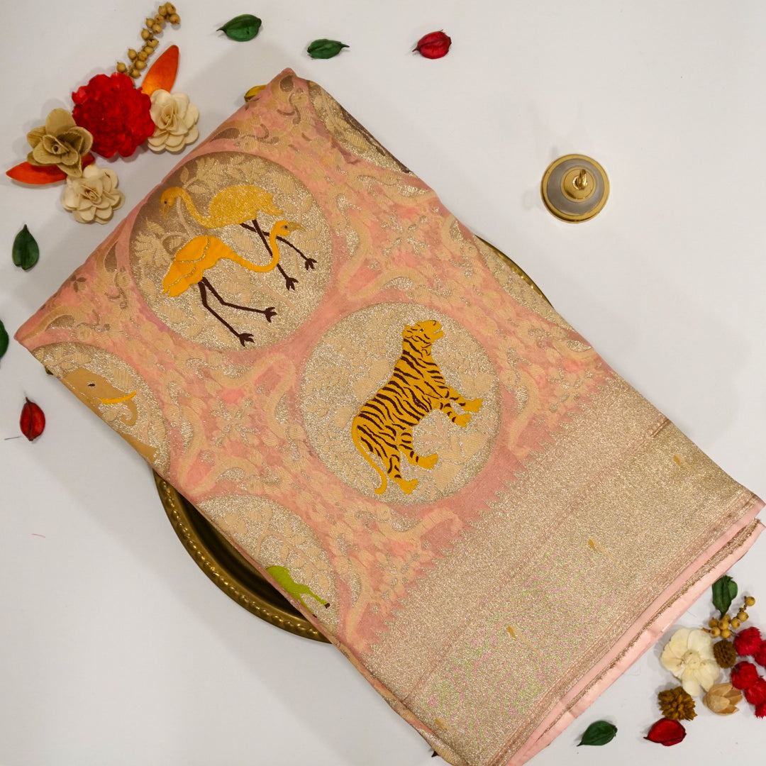 KUBERAN PASTEL PINK AND CREAM BANARAS SATIN SAREE.