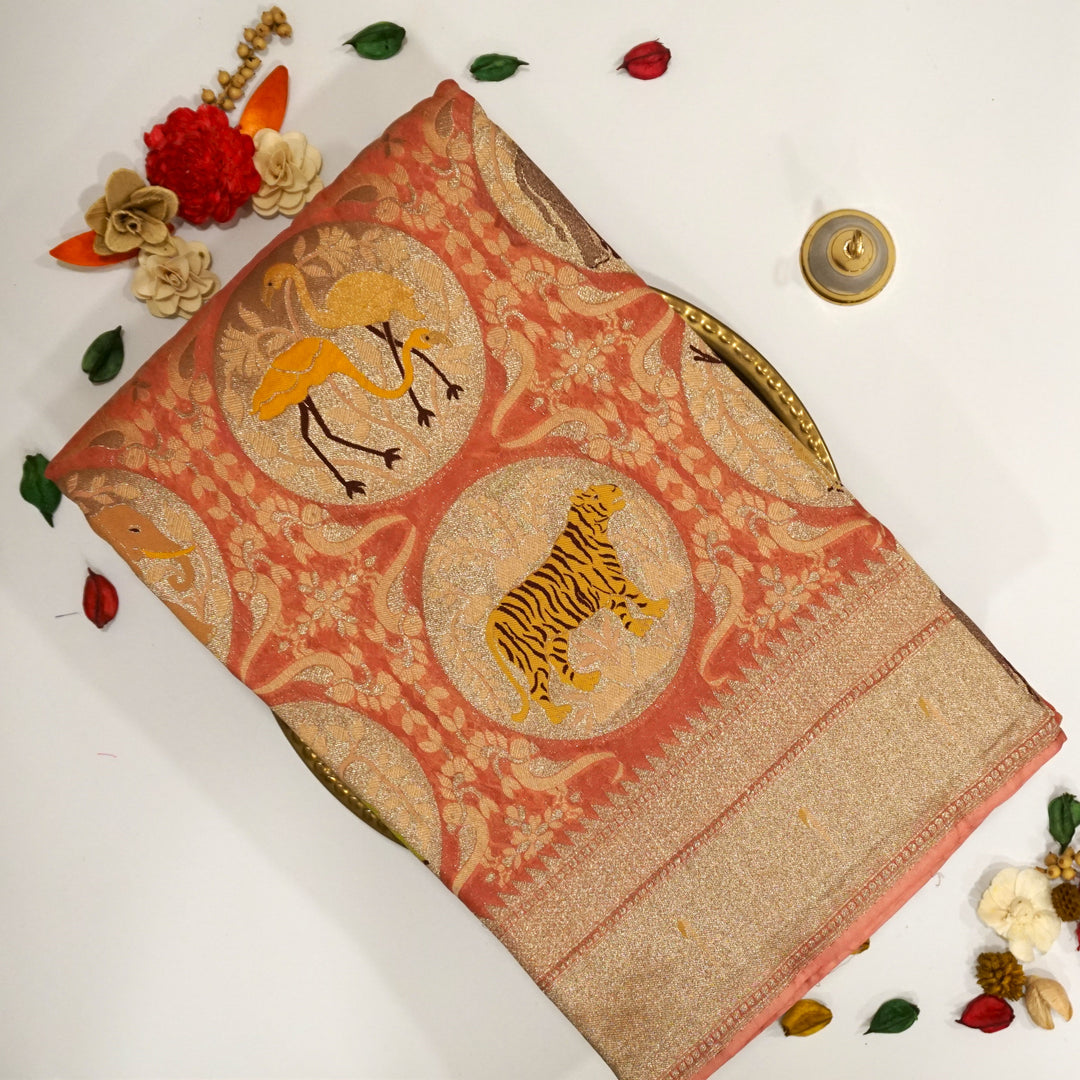 KUBERAN ORANGISH RED BANARAS SATIN SAREE.
