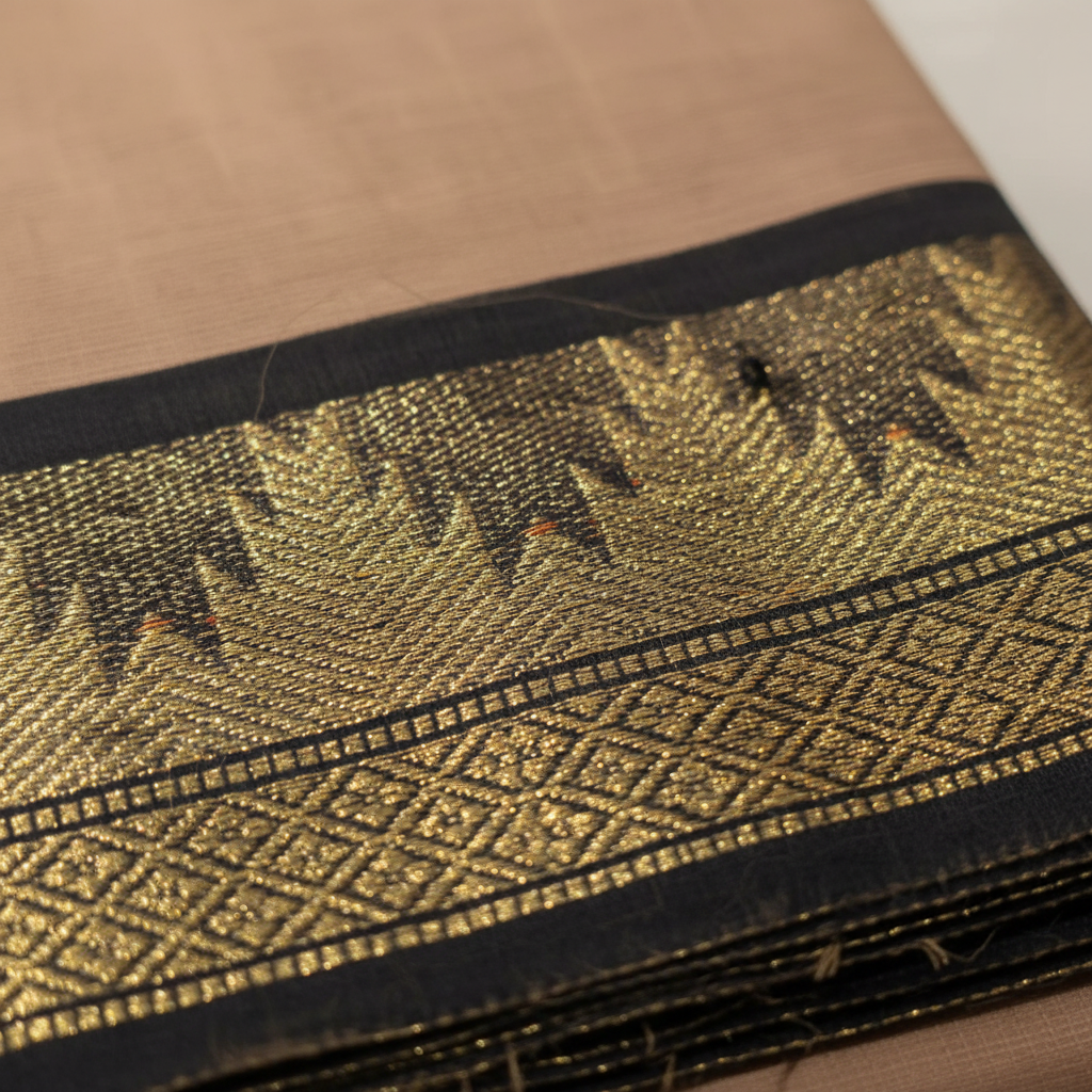 - Border: Black fabric with traditional golden zari weaving
