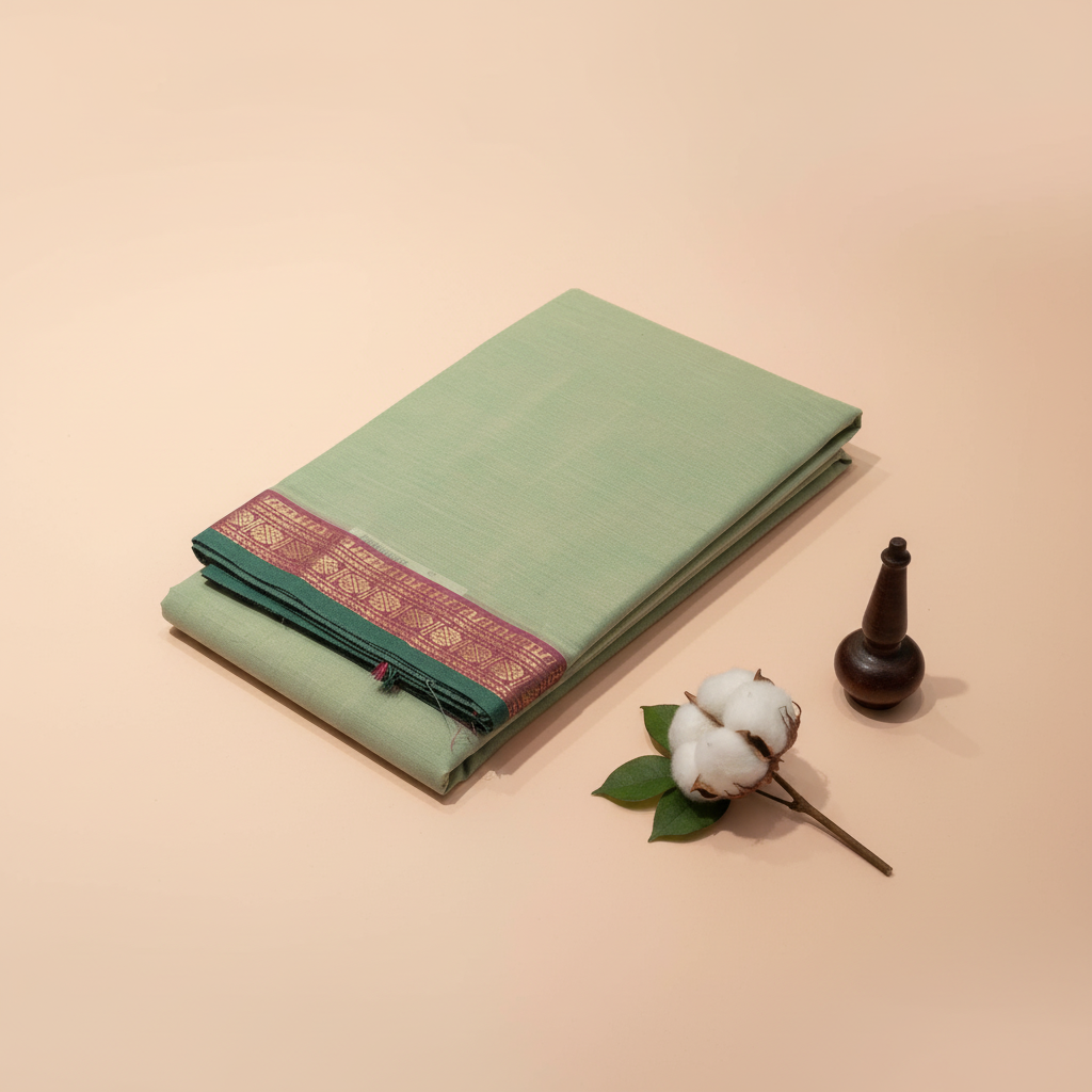 Embrace fresh elegance with this exquisite cotton saree in a soft pista green hue. Featuring a beautiful contrasting pink zari border with intricate geometric patterns, this saree offers a delightful blend of contemporary color and traditional craftsmanship.