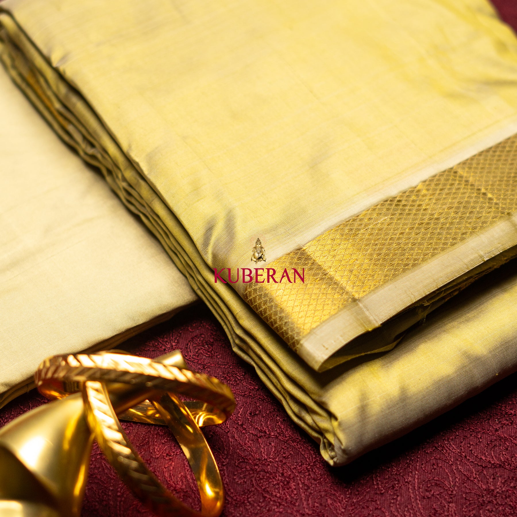 Indulge in luxury with our Kuberan greenish gold WITH GOLD BORDER Pure Silk Dhoti! Made with pure silk, this dhoti exudes elegance and sophistication. The stunning gold border adds a touch of opulence to this traditional attire. Elevate your style and make a statement with the finest quality silk dhoti.