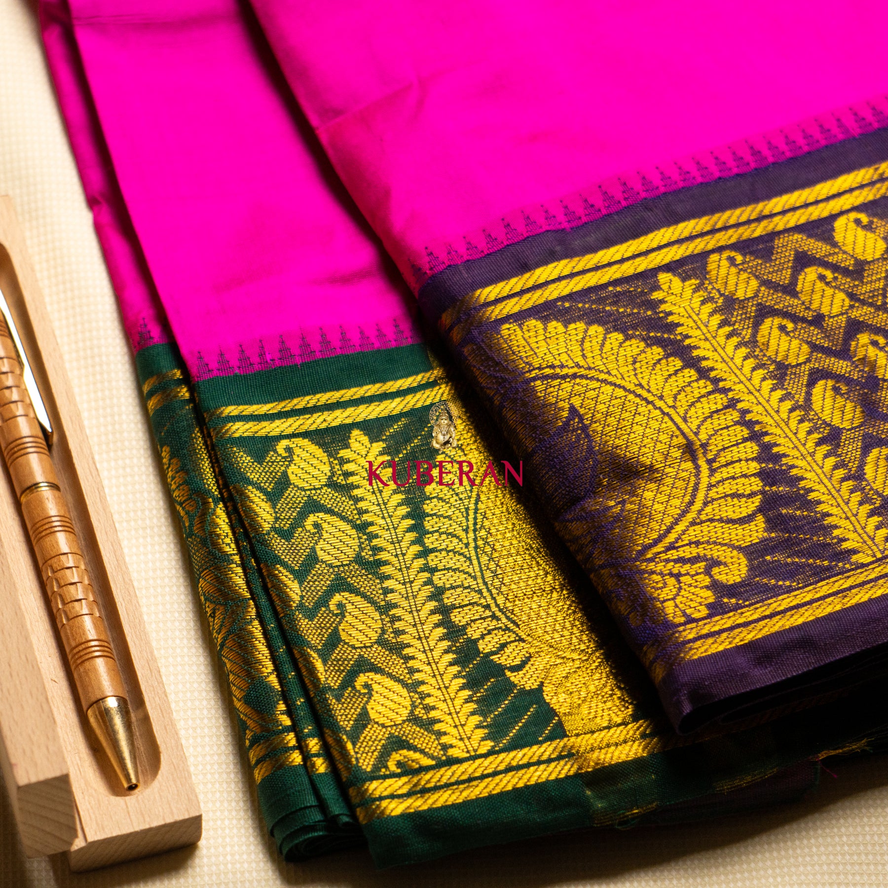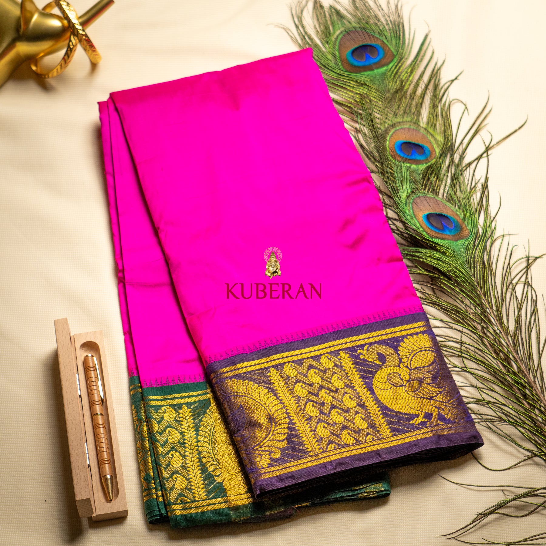 Experience the luxurious elegance of our Kuberan Pink Pure Silk Dhoti, adorned with a stunning purple and green border. Made from high-quality silk, this dhoti exudes both style and comfort. Elevate your traditional attire with this vibrant and richly designed piece.