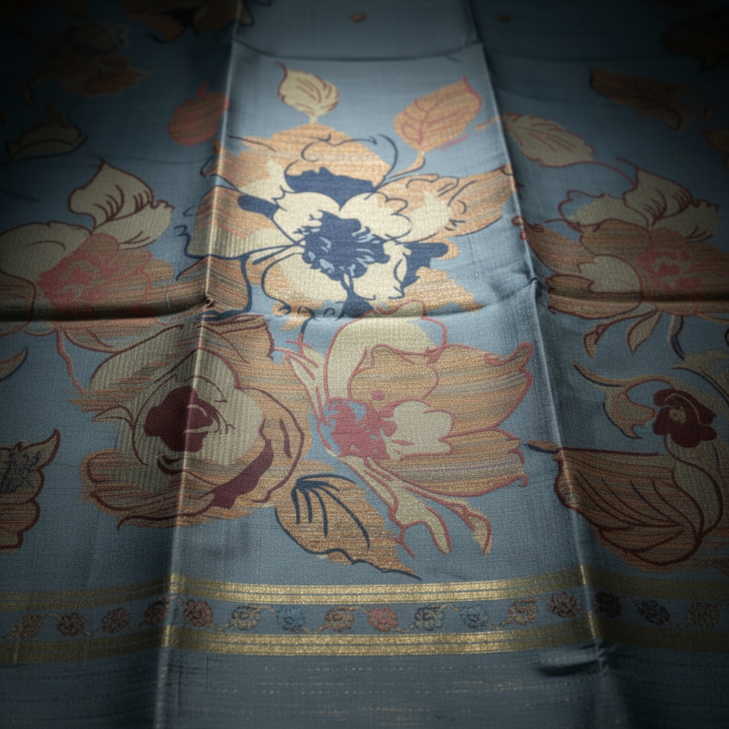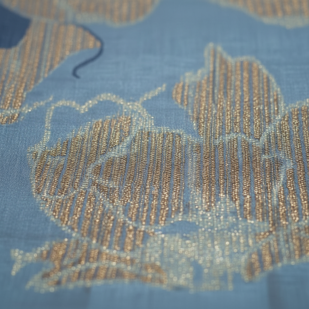 Exquisite sky blue RAW silk saree featuring intricate floral brocade work in gold and rose tones. This luxurious piece showcases traditional craftsmanship with delicate lotus and leaf motifs woven throughout the fabric.