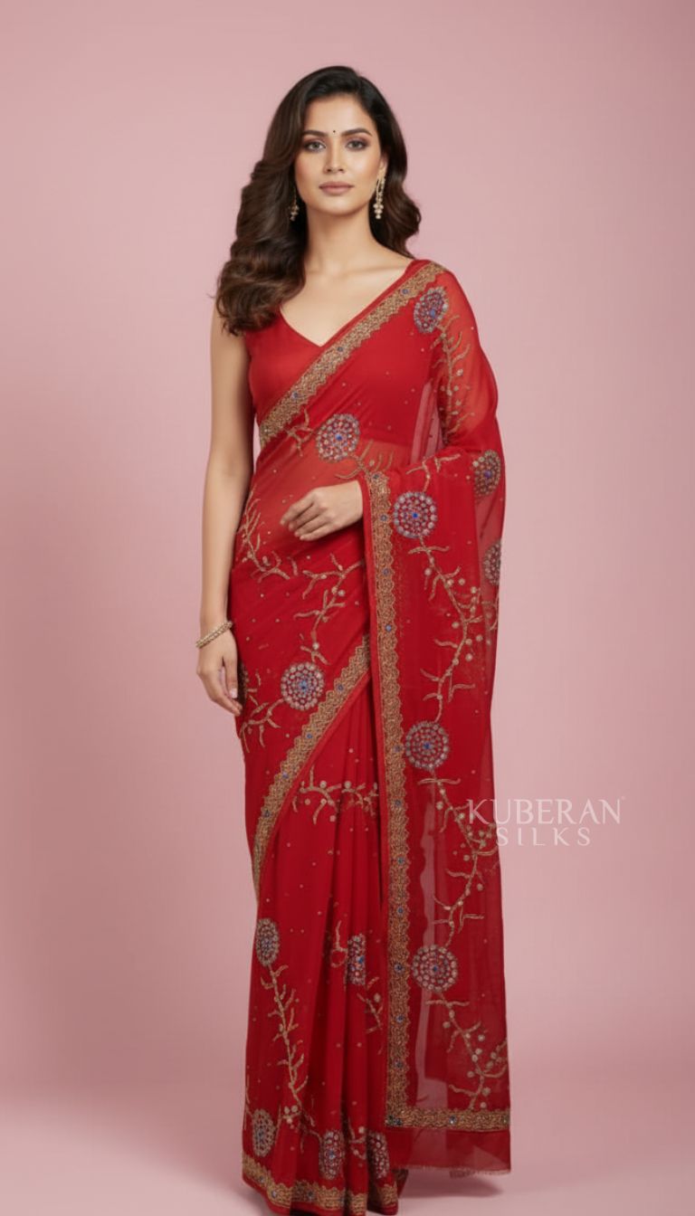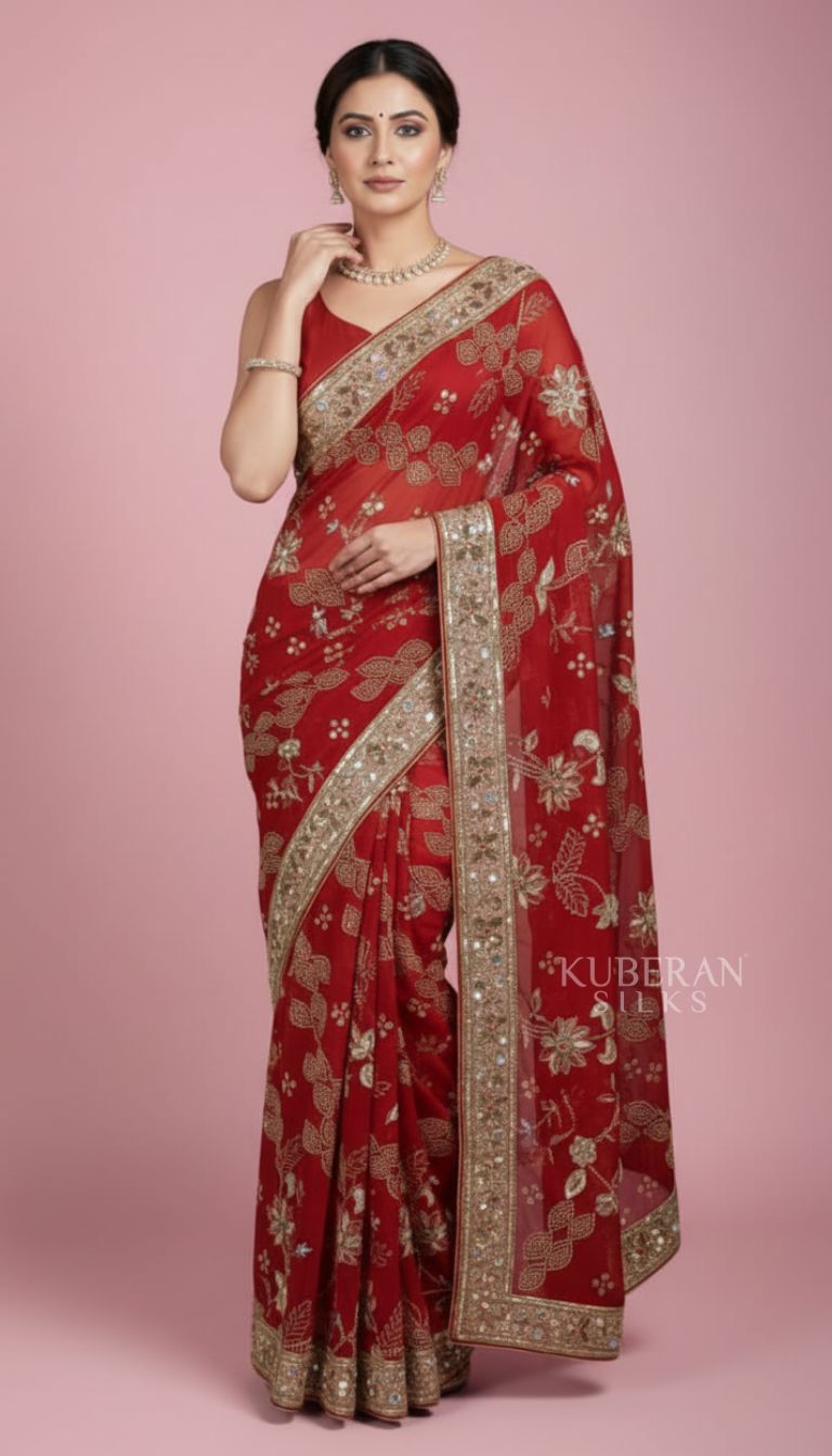Kuberan Red Embroidered Saree with Floral Work