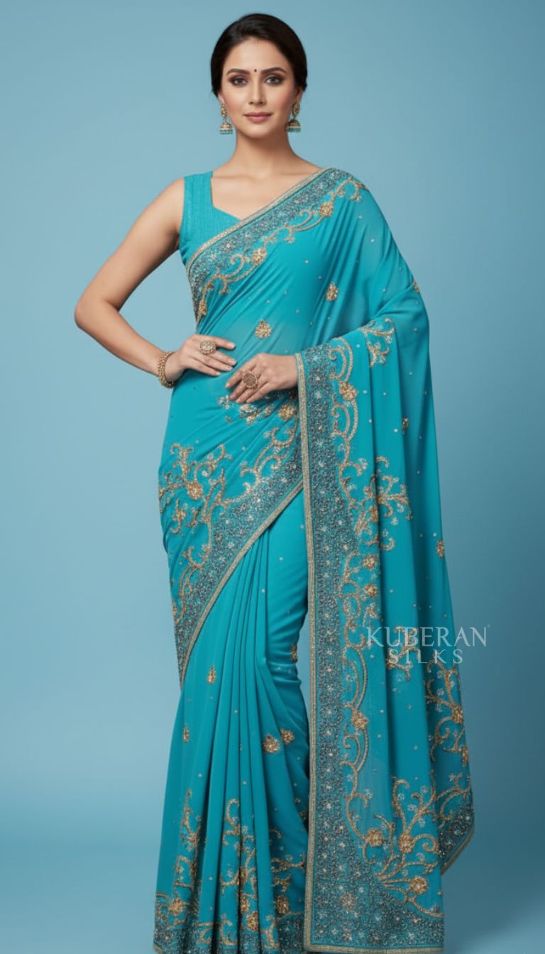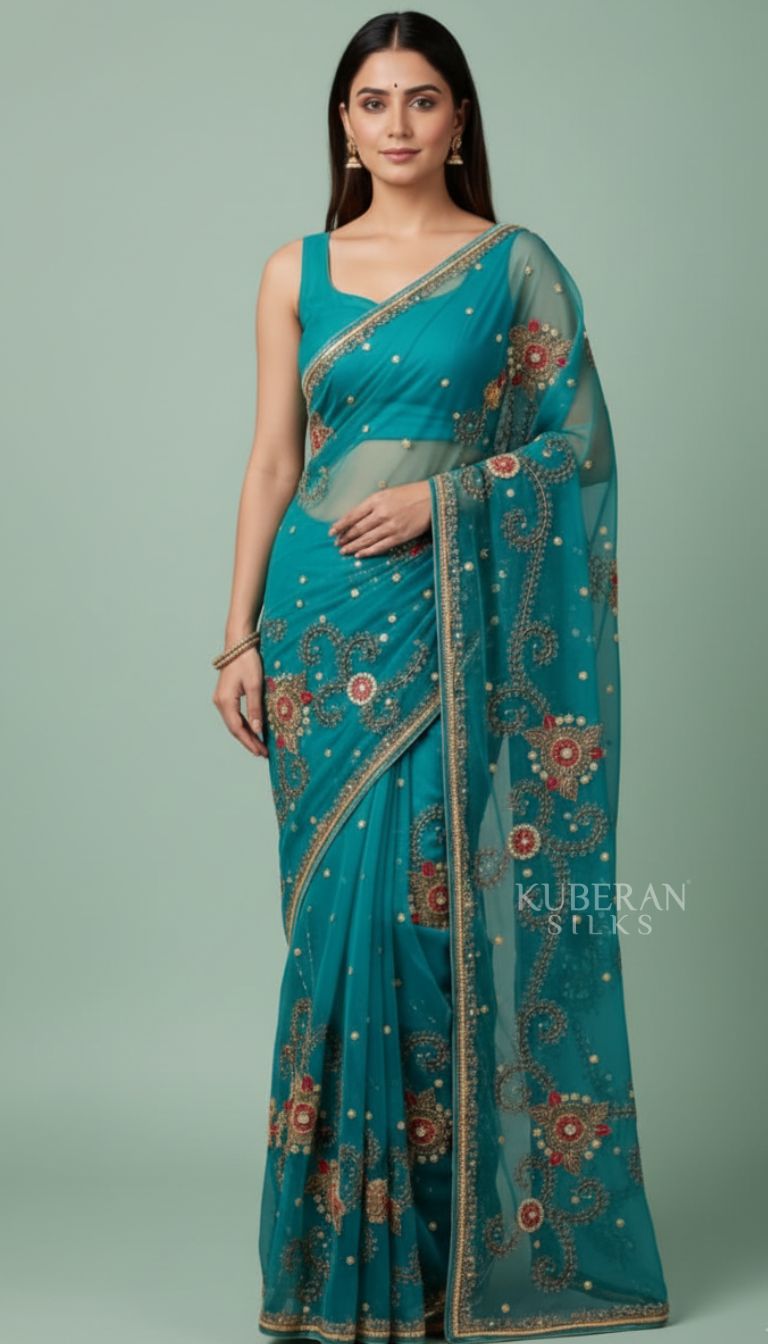 Kuberan Turquoise Embroidered Saree with Floral Work