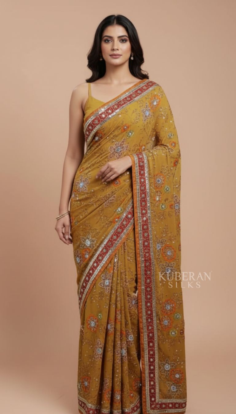 Kuberan Mustard Embroidered Saree with Floral Motifs