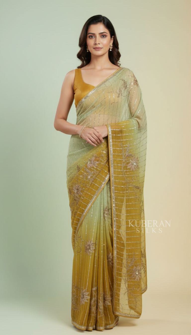 Kuberan Elegant Yellow-Green Ombre Saree with Floral Embroidery