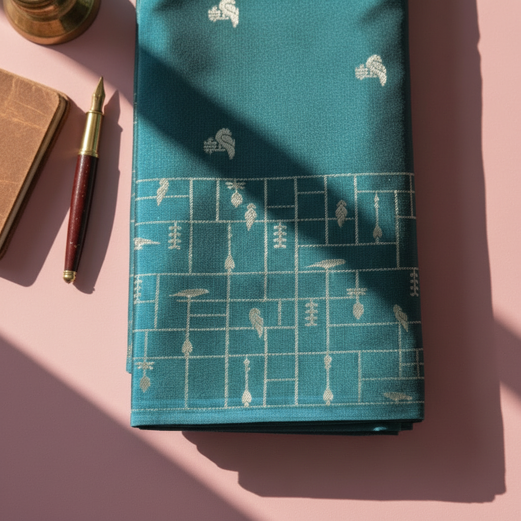 Captivating teal SEMI silk saree featuring elegant silver motifs and a sophisticated geometric border pattern. This contemporary yet traditional saree offers a perfect blend of modern color and classic design, making it ideal for both festive occasions and elegant gatherings.