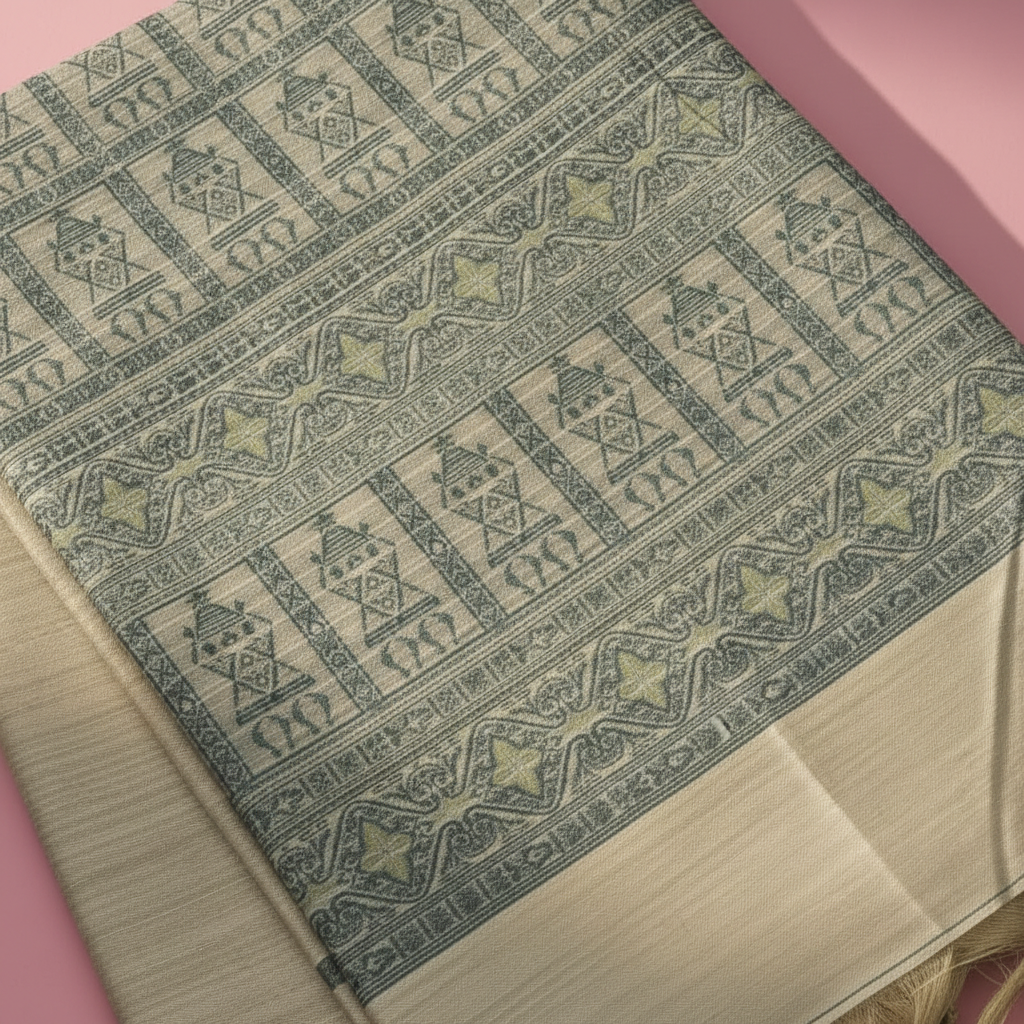 Experience timeless elegance with this exquisite traditional  RAW silk saree featuring intricate geometric motifs and temple-inspired patterns. The cream body is beautifully adorned with sage green woven designs that showcase masterful craftsmanship.
