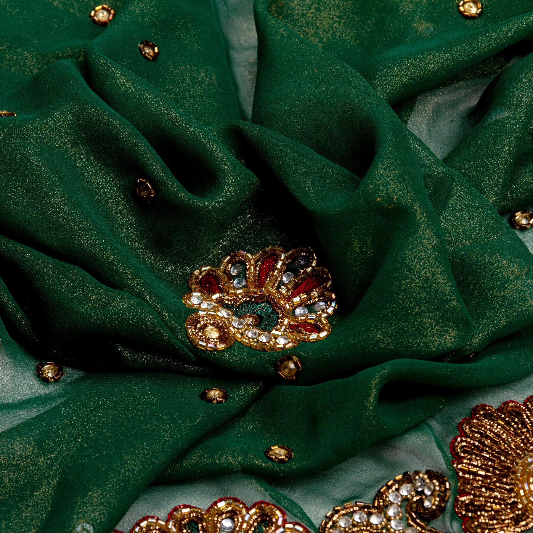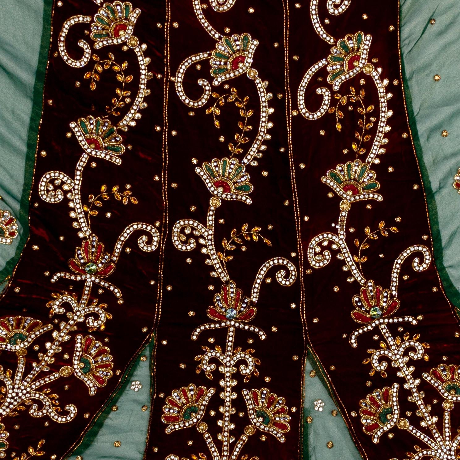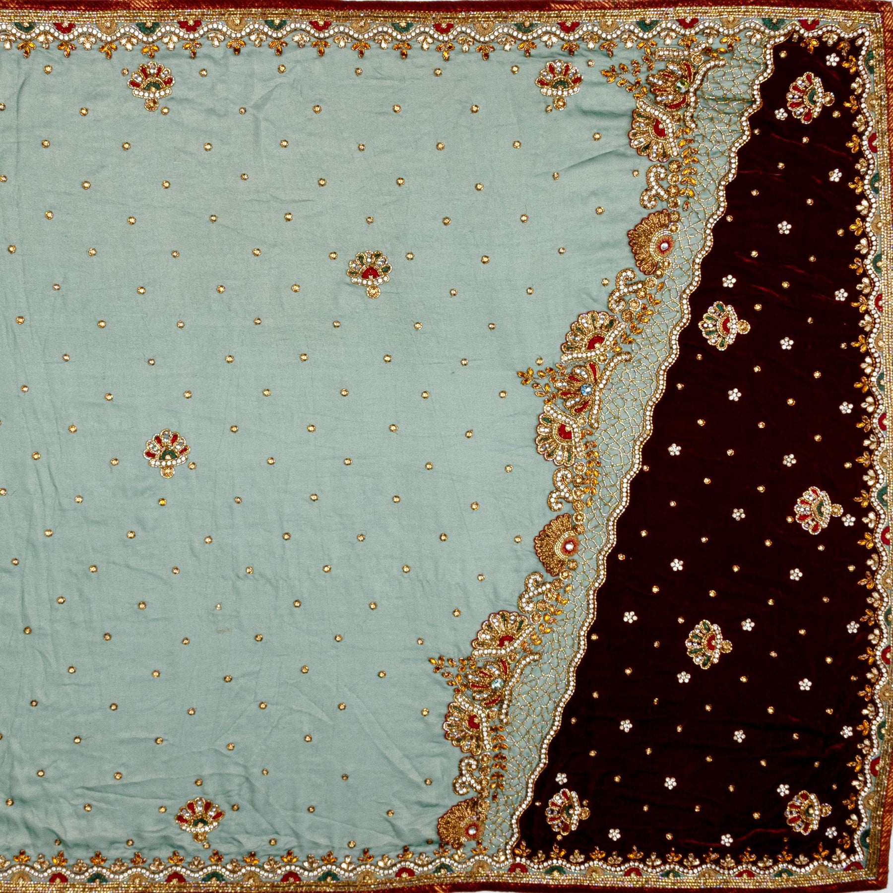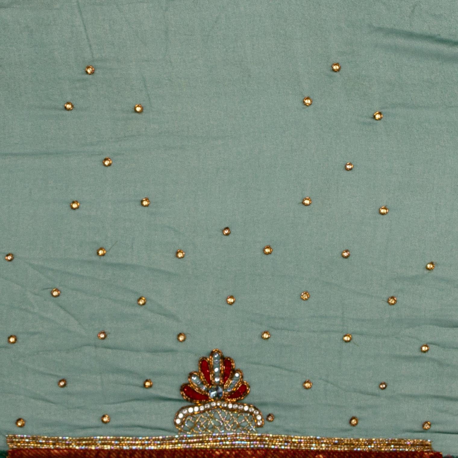 Hey, grab the latest collections from the house of KUBERAN. This saree is a hand-embroidered saree which is a must-have for all special occasions. This saree is a Green Maroon color with beautiful Kundan and stone designs and gives a royal look to the wearer, don't miss this saree to add to your wardrobe. This saree is a set with an unstitched embroidered blouse.
