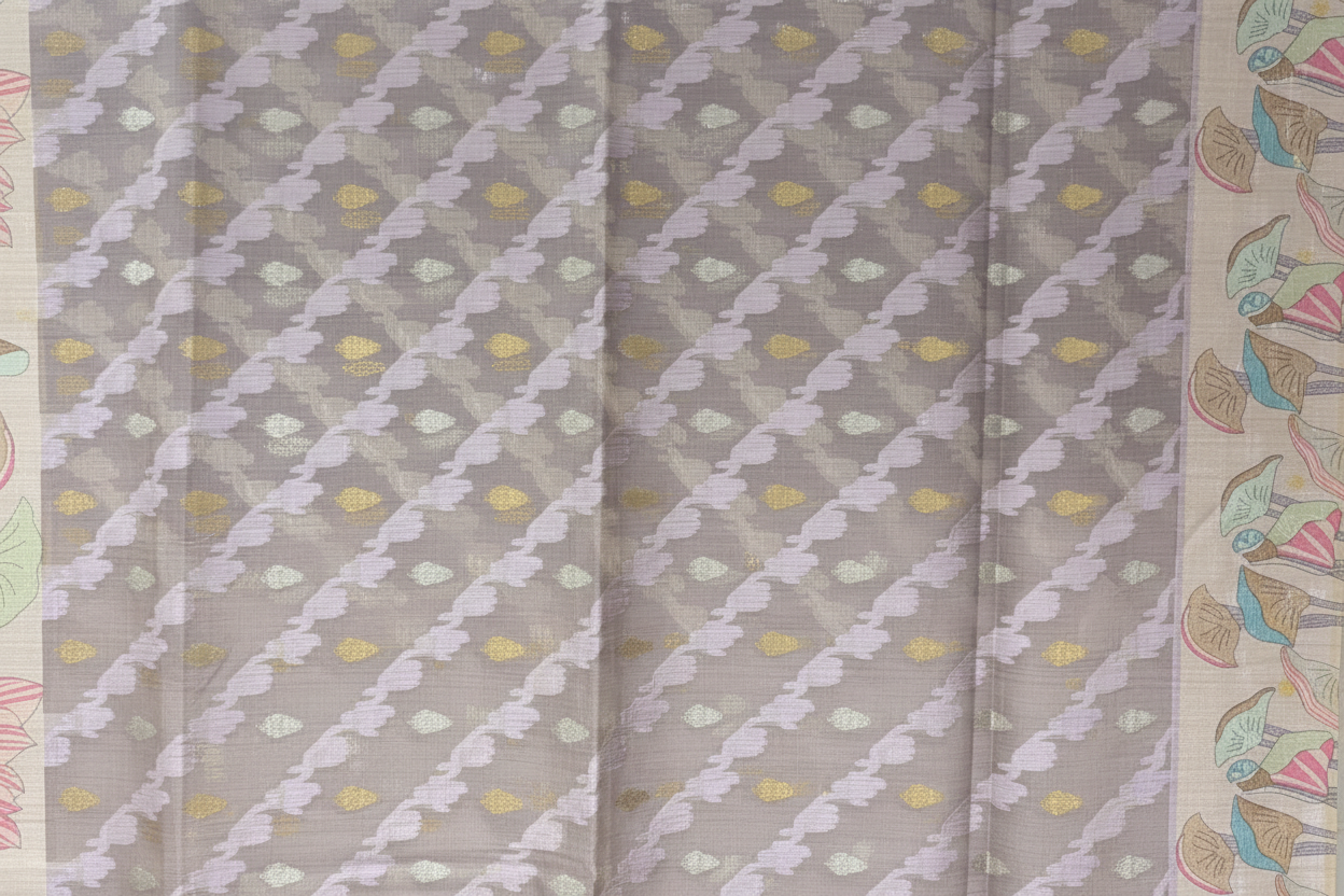 Exquisite organza brasso saree featuring a beautiful lotus and leaf motif border in pastel hues of pink, green, and turquoise. The saree body showcases an elegant ikat pattern in grey and creating a perfect blend of traditional craftsmanship and contemporary design.