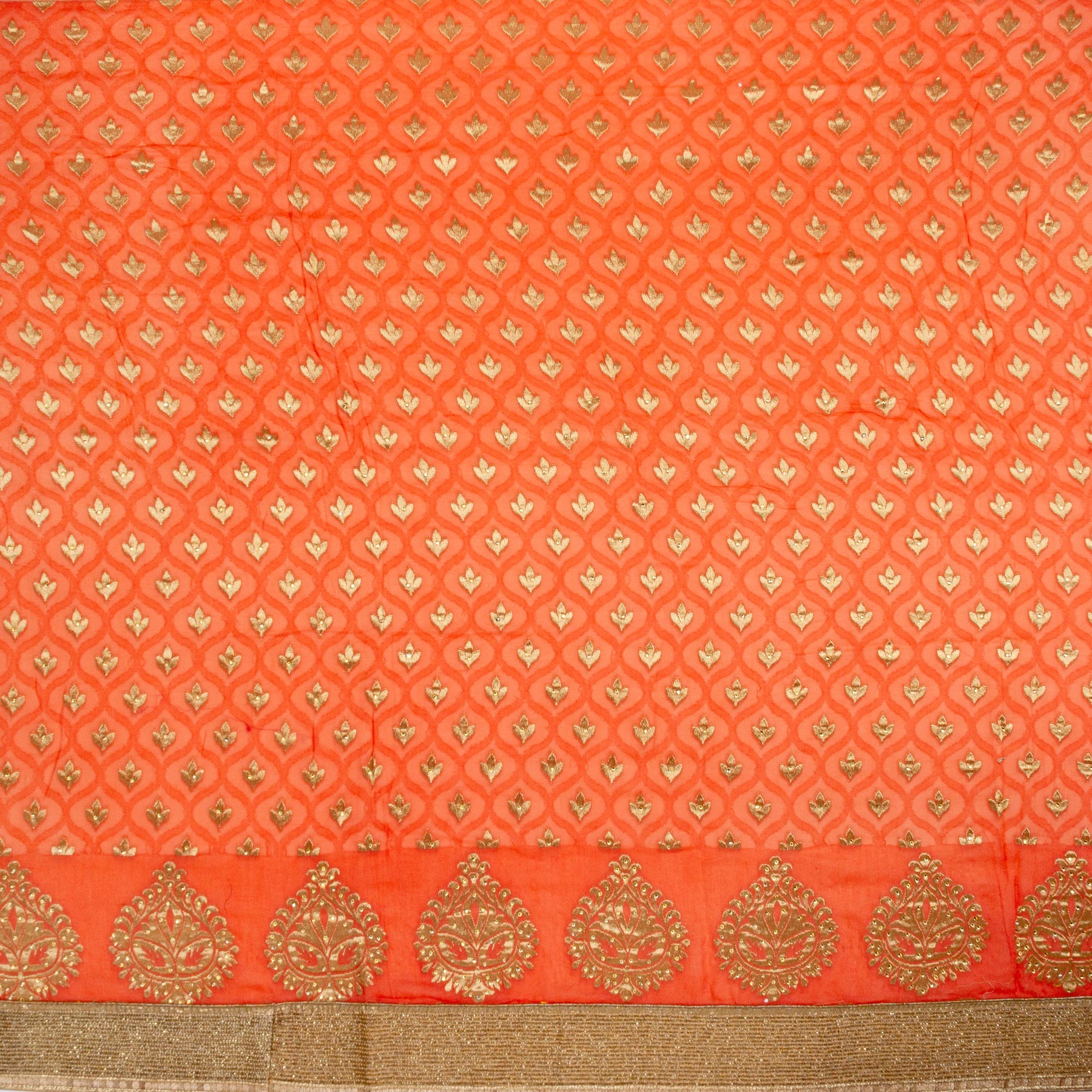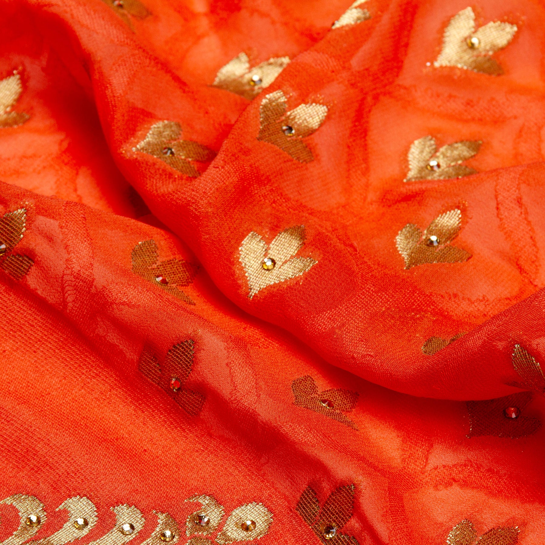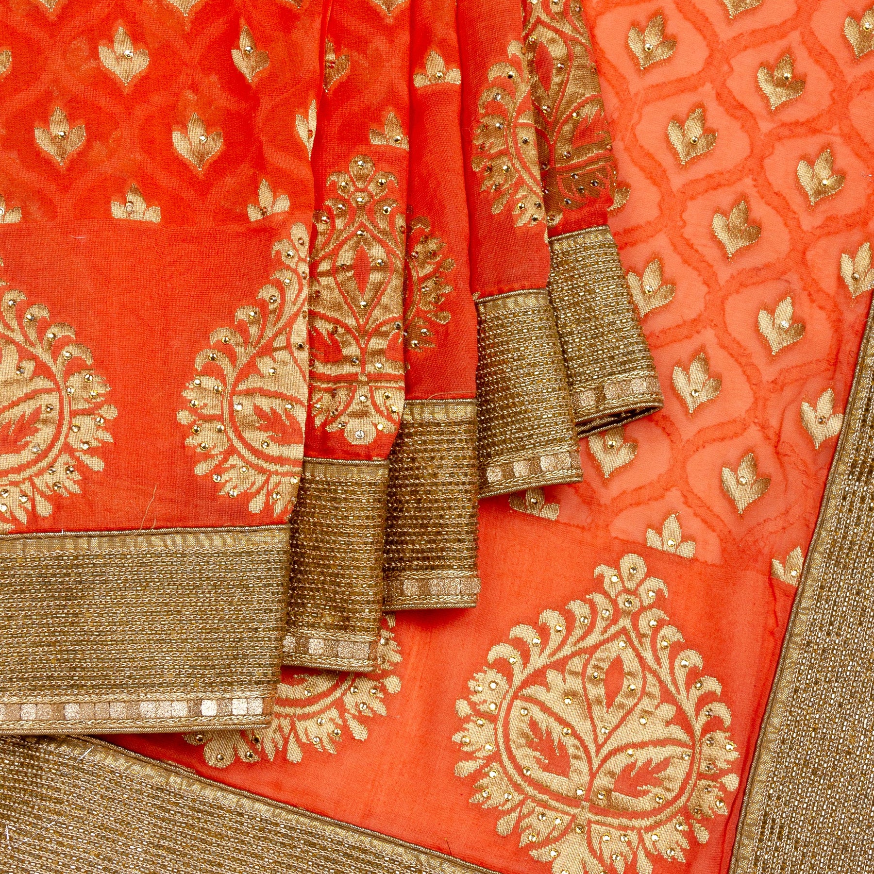 Hey, grab the latest collection from the house of KUBERAN. This saree is a hand-embroidered saree which is a must-have for all special occasions. This saree is an Orange color with beautiful Kundan and sequence work designs which gives a royal look to the wearer, don't miss this saree to add to your wardrobe. This saree is a set with an unstitched embroidered blouse.