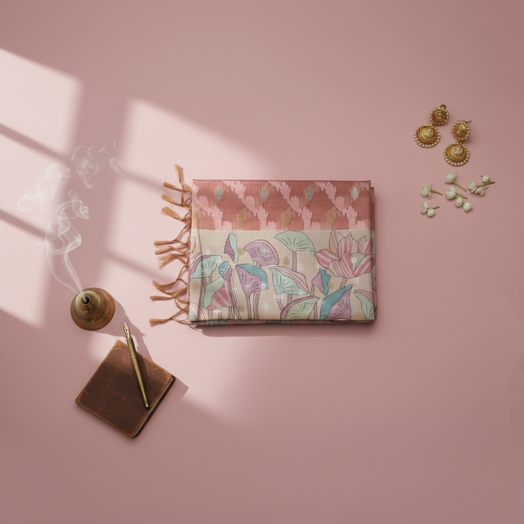 This saree beautifully blends traditional craftsmanship with contemporary pastel aesthetics, making it a timeless addition to your ethnic wardrobe.