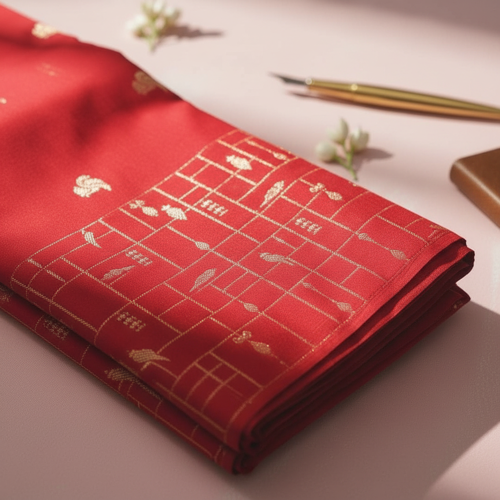 Exquisite red SEMI silk saree featuring elegant gold motifs throughout the body and a stunning geometric pattern border. This premium saree combines traditional craftsmanship with contemporary design, perfect for weddings, festivals, and special occasions.