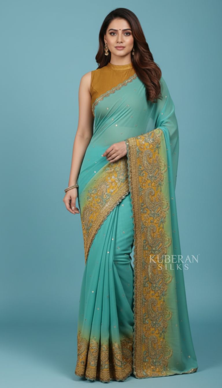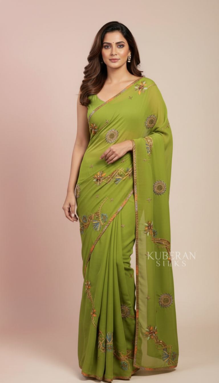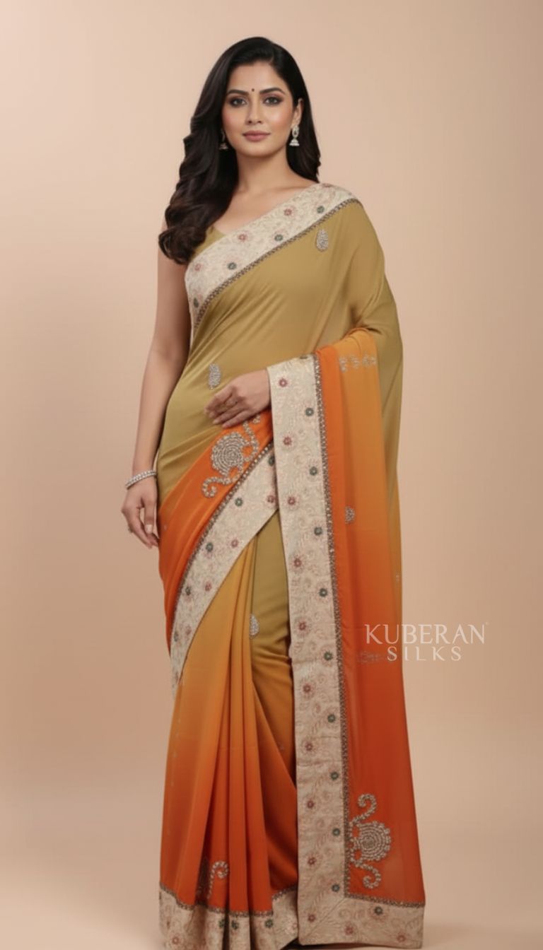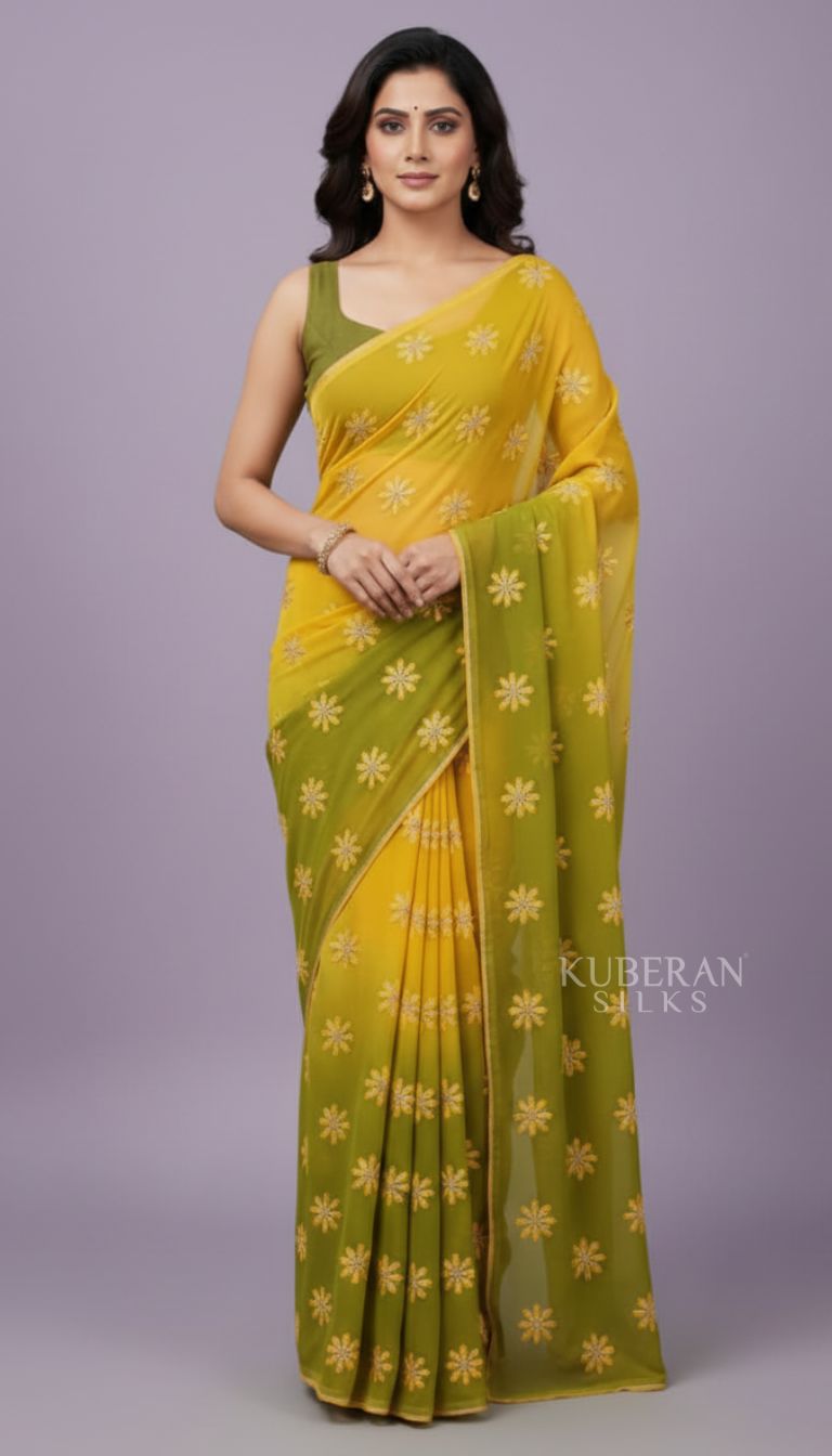 Kuberan Yellow-Green Ombre Embroidery Saree