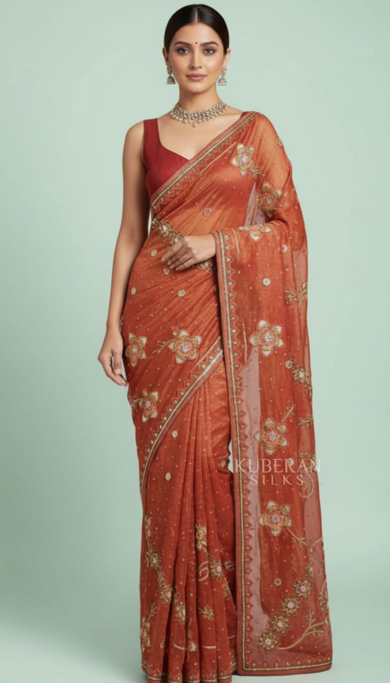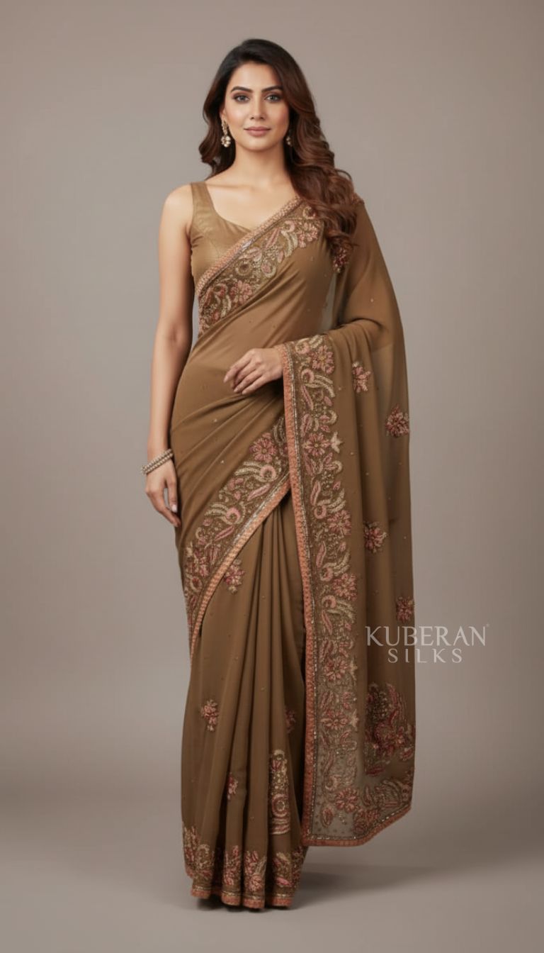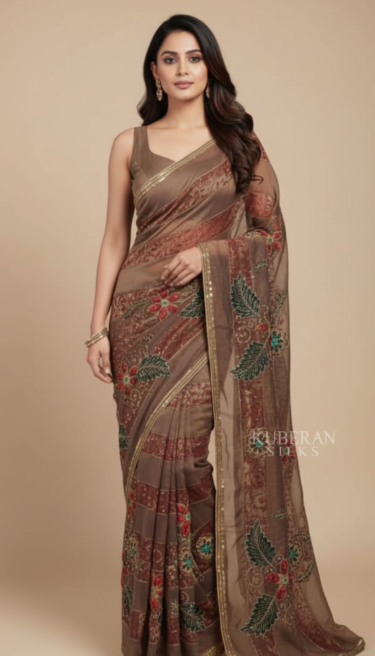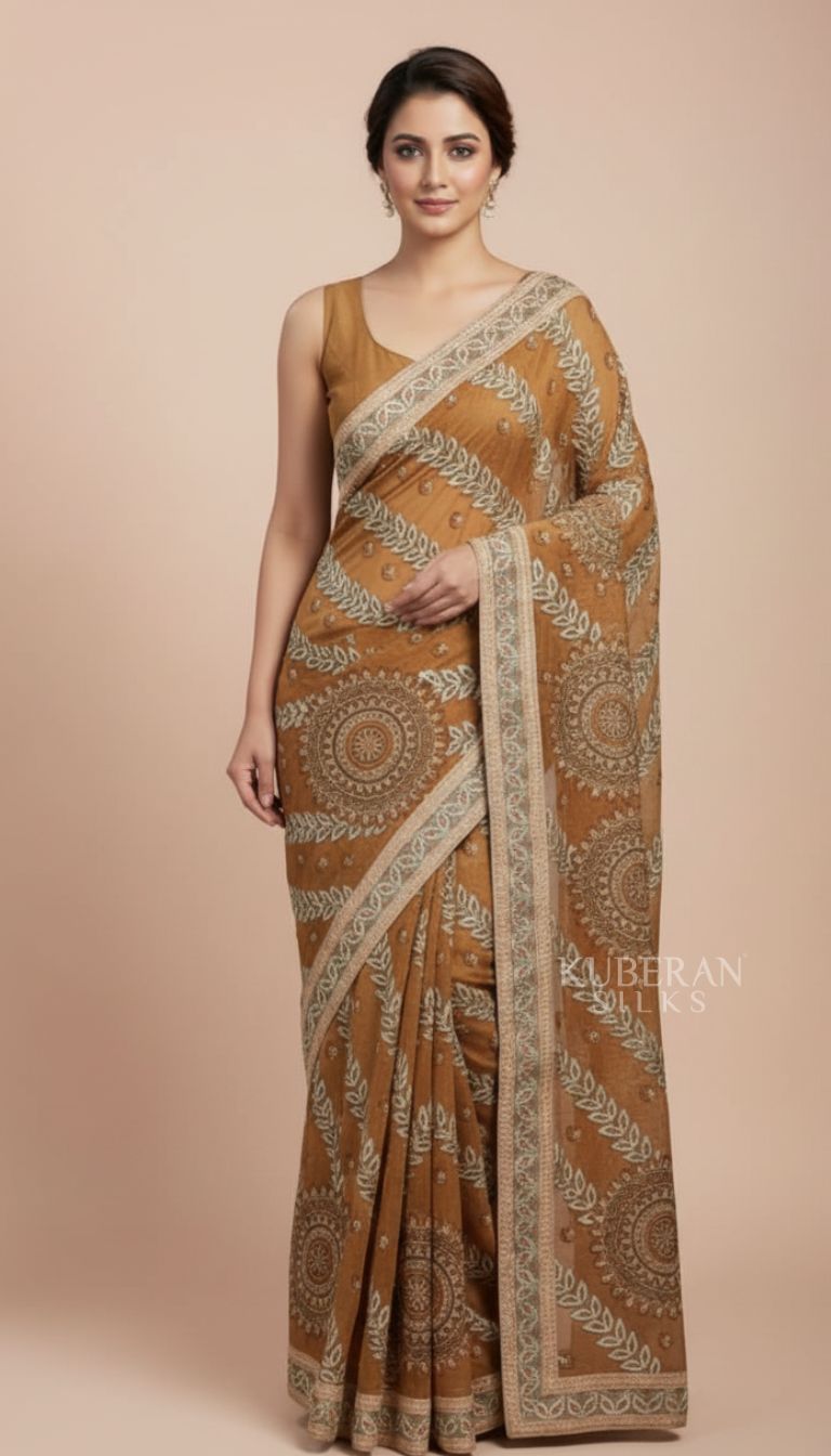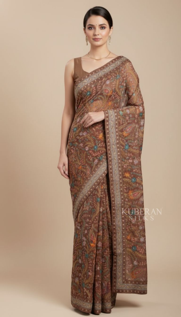 Kuberan Brown Saree with Peacock and Floral Embroidery