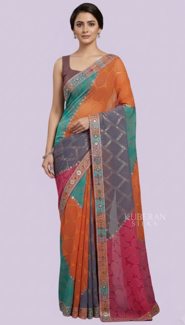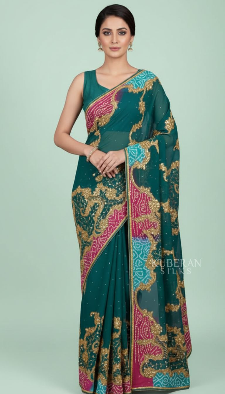 Kuberan Teal Bandhani Saree with Multicolor Embroidery