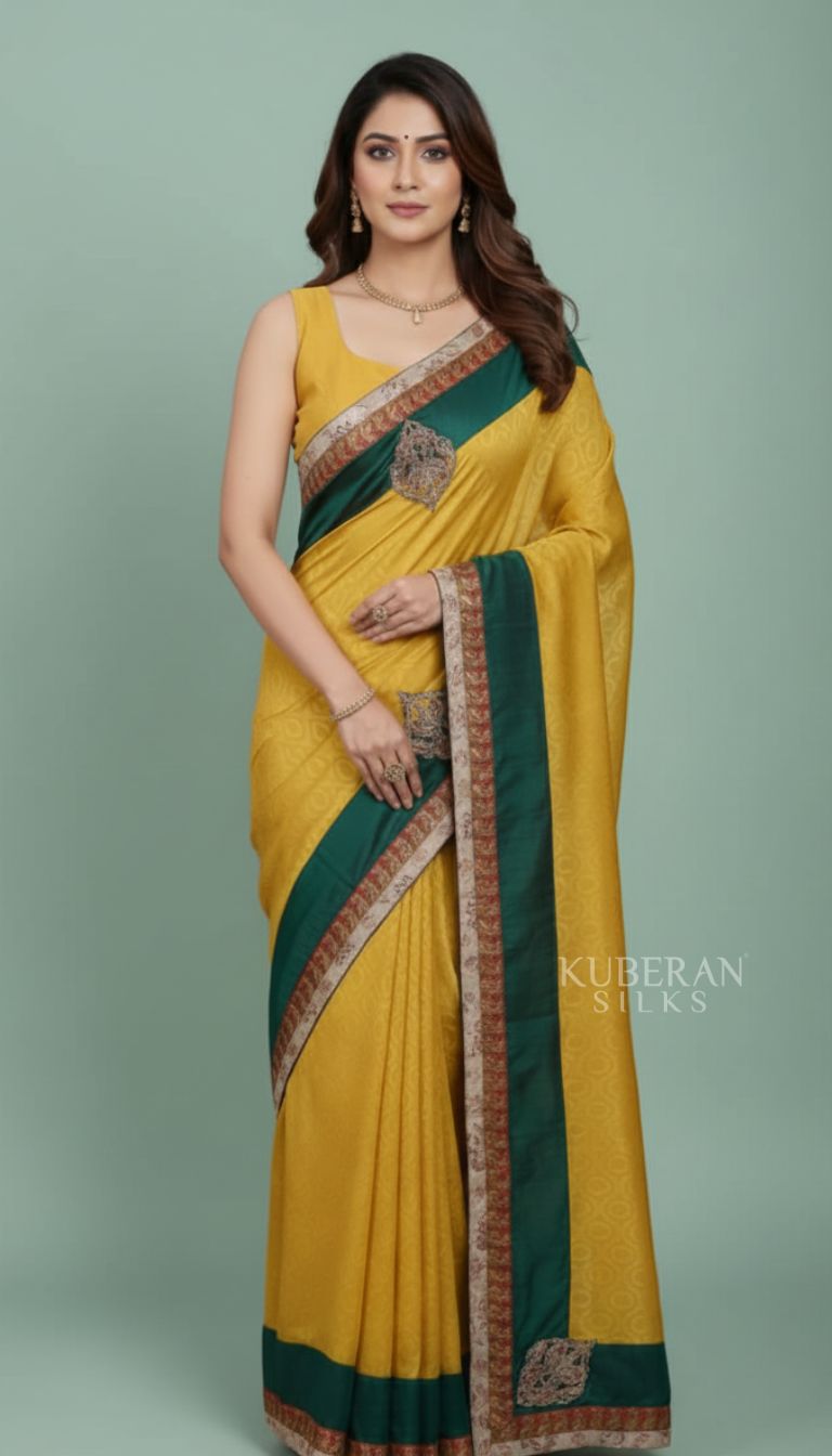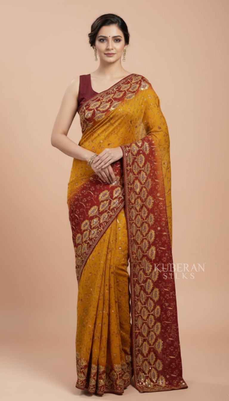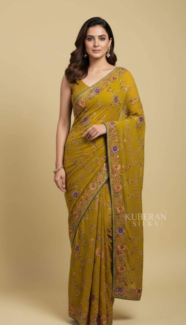 Kuberan Mustard Yellow Embroidered Saree with Floral Patterns