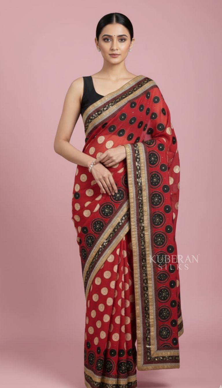 Kuberan Red Embroidery Saree with Gold Polka Dots