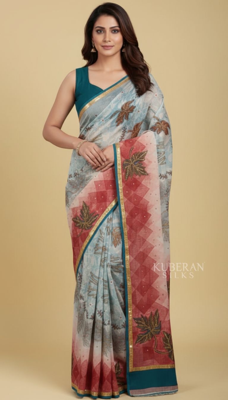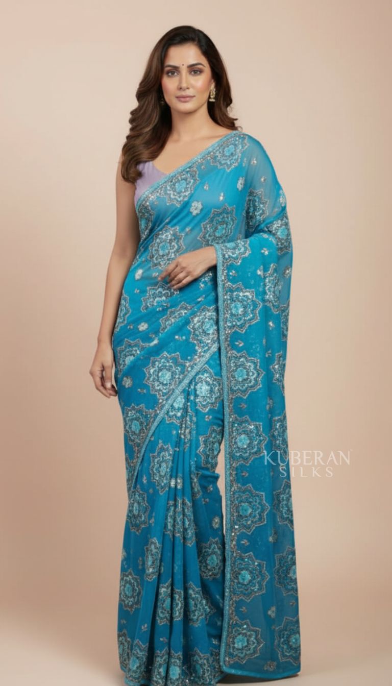 Kuberan Turquoise Blue Embroidery Saree with Silver Motifs