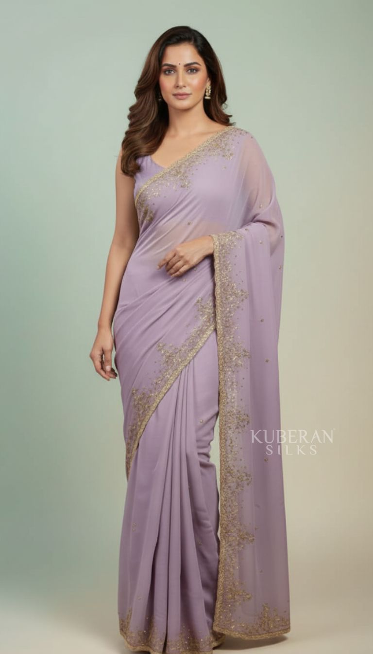 Kuberan Purple Saree with Gold Border and Floral Motifs