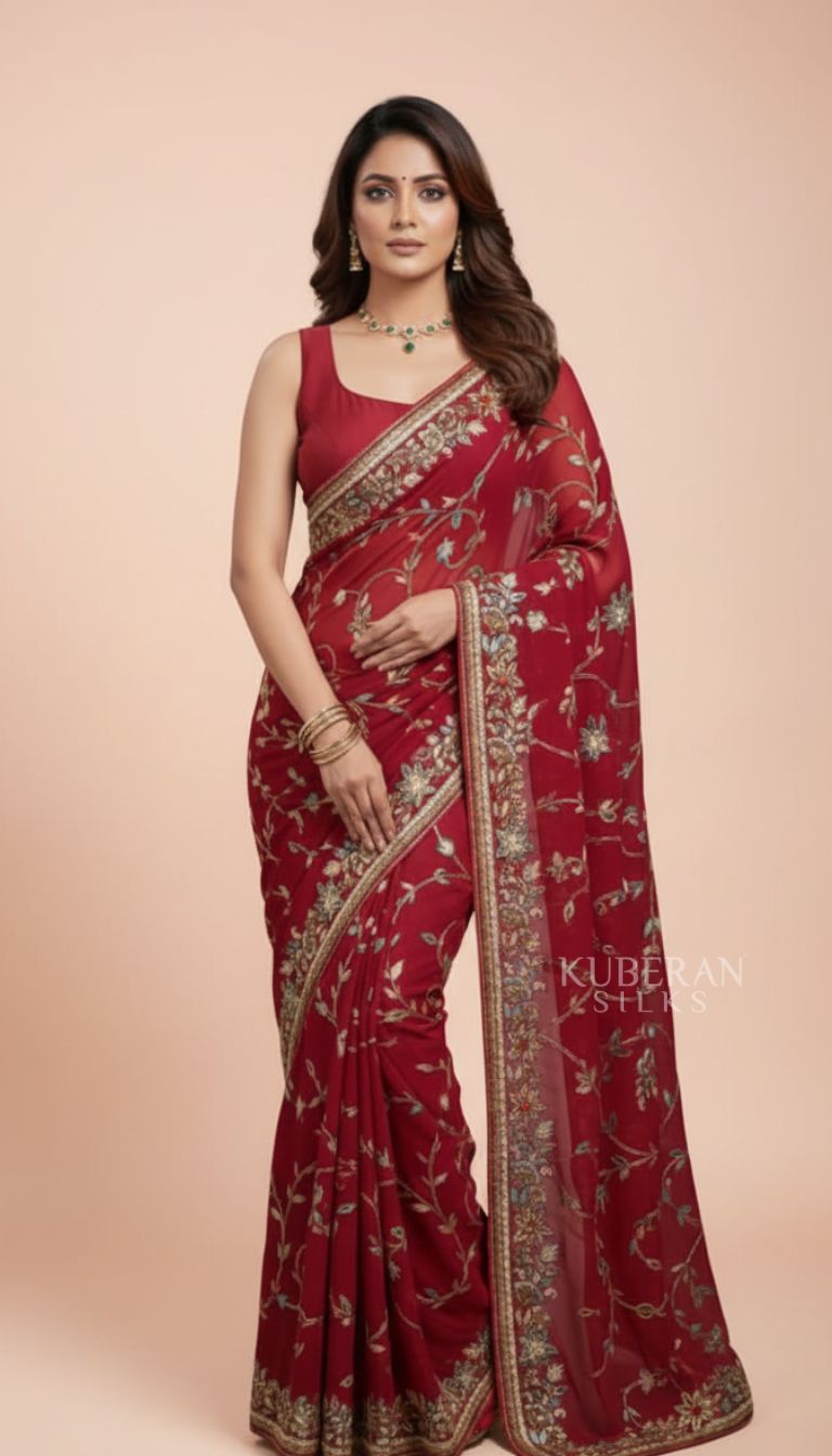 Kuberan Red Floral Embroidered Saree with Gold Border