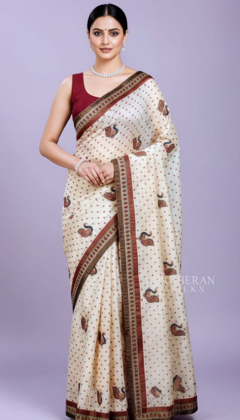 Kuberan Cream Saree with Peacock Motifs and Maroon Border