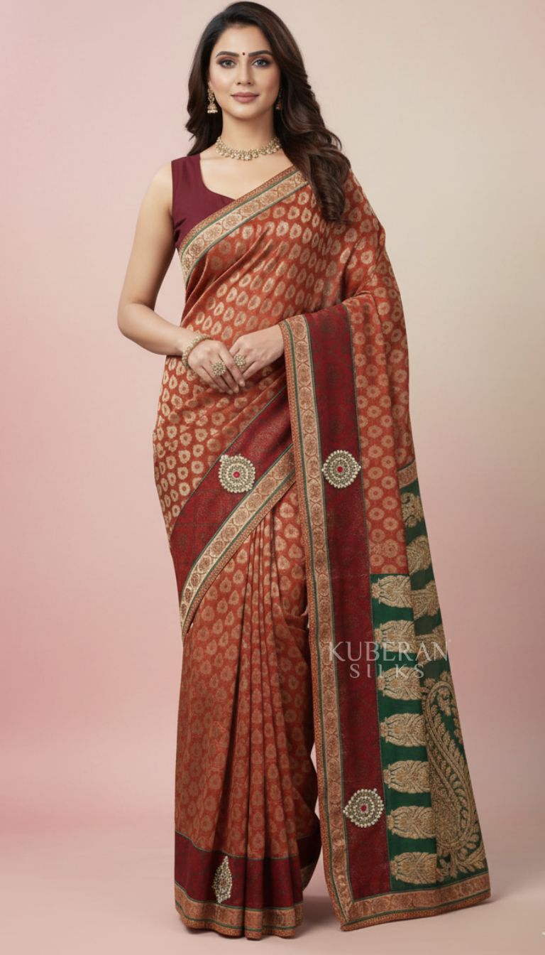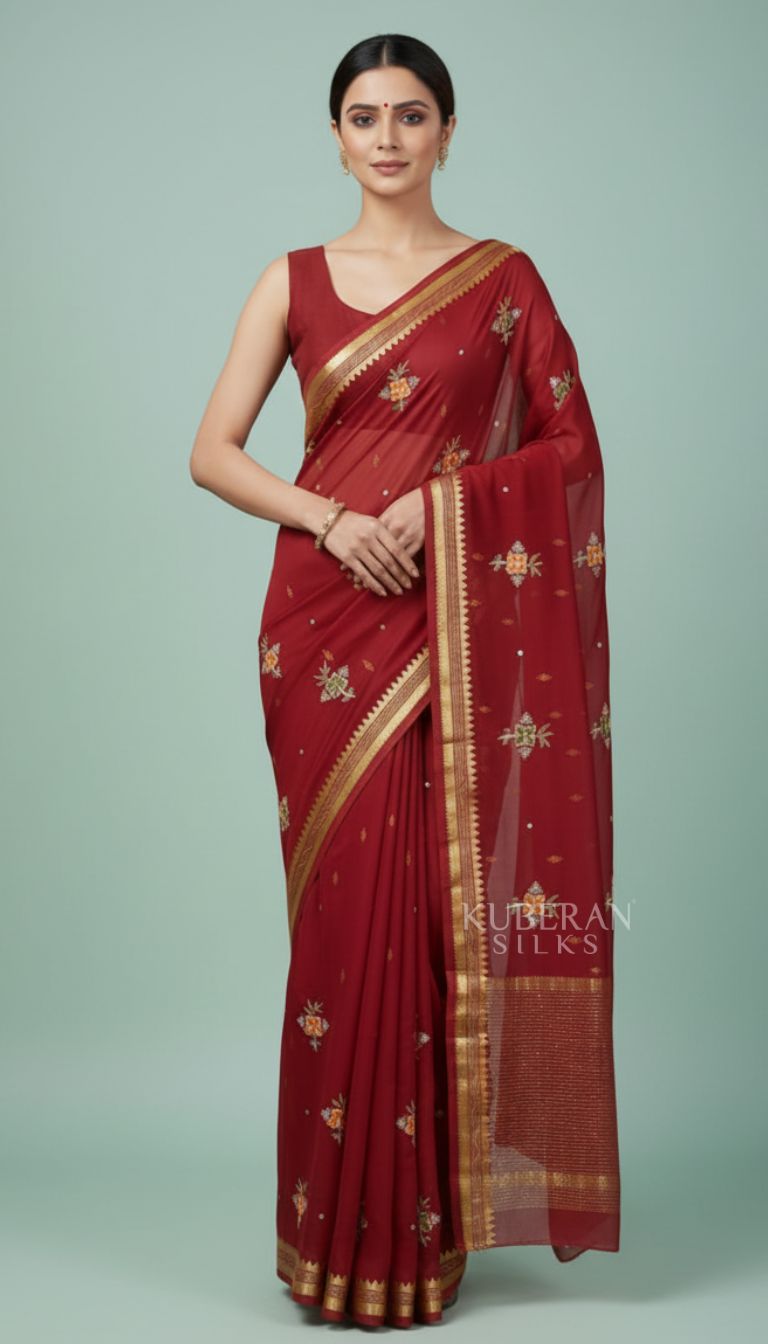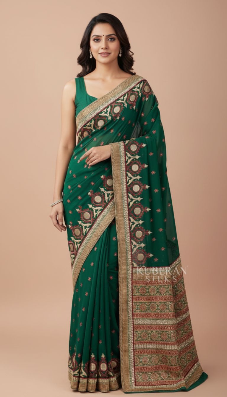 Kuberan Emerald Green and Maroon Embroidered Saree