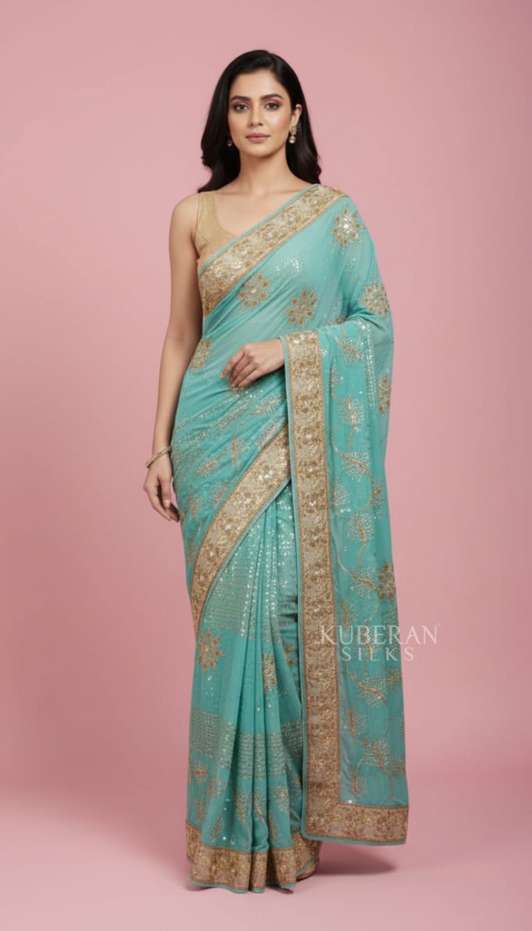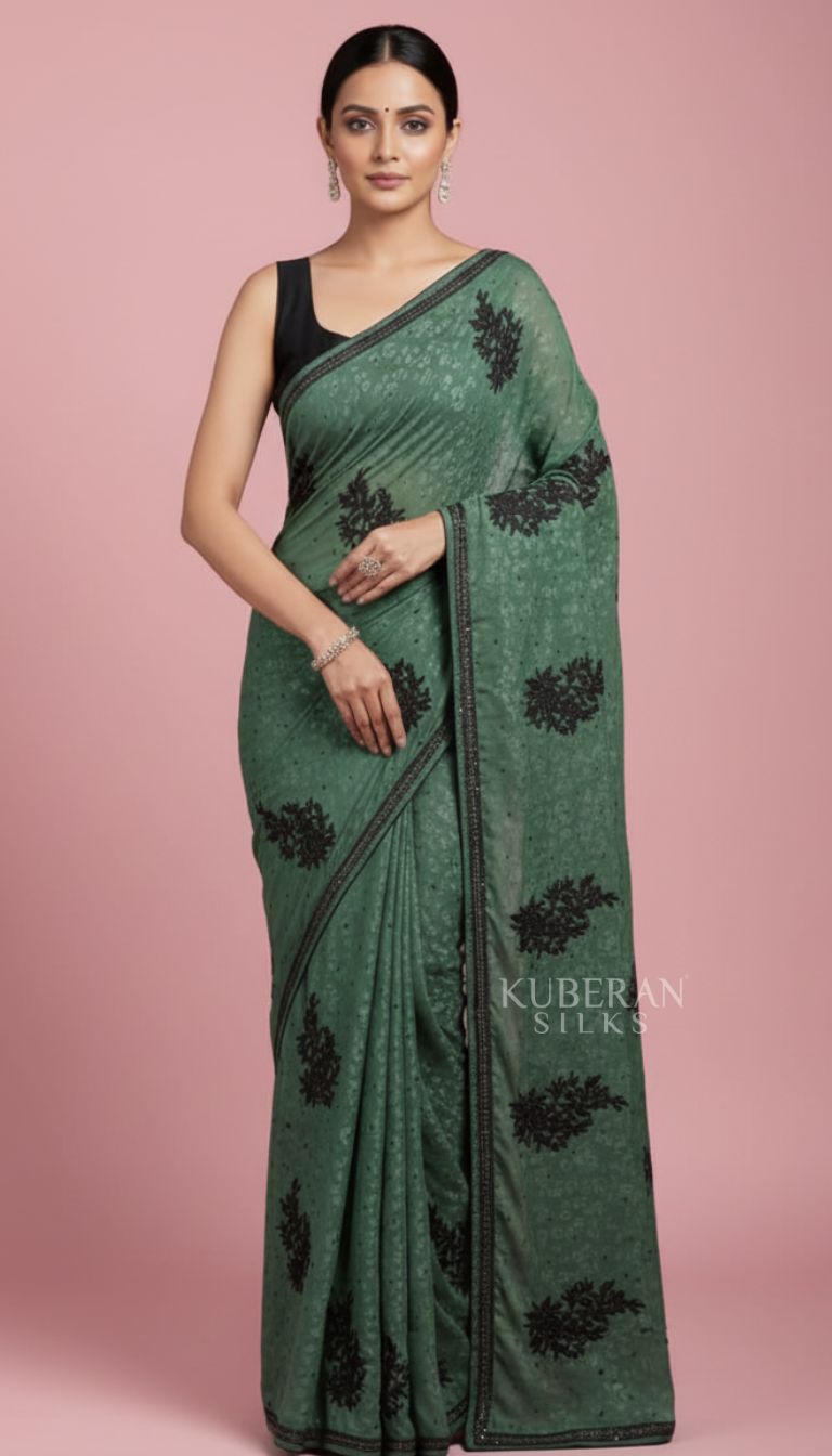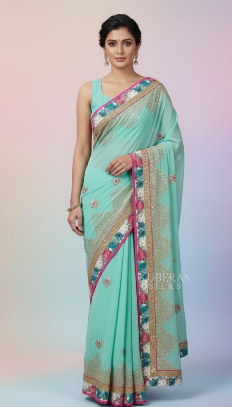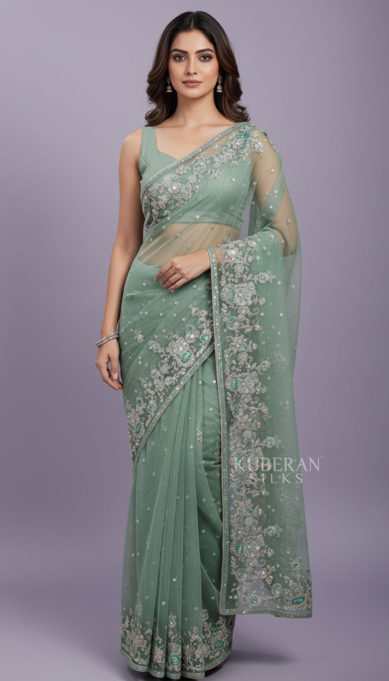 Kuberan Mint Green Embroidered Saree with Floral Border