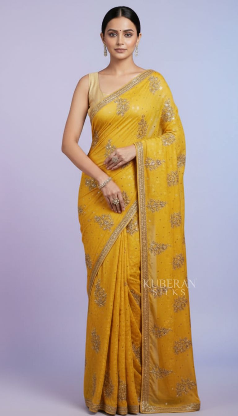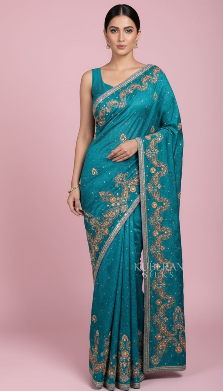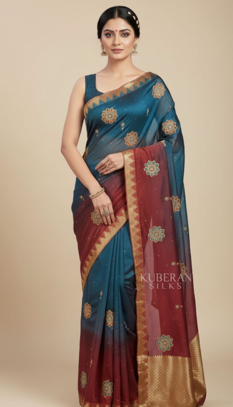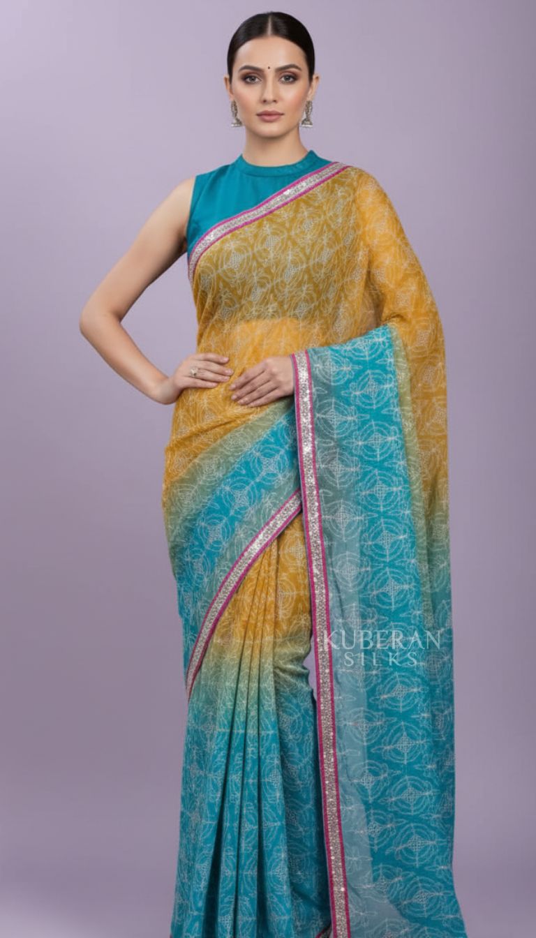 Kuberan Yellow and Teal Ombre Embroidery Saree