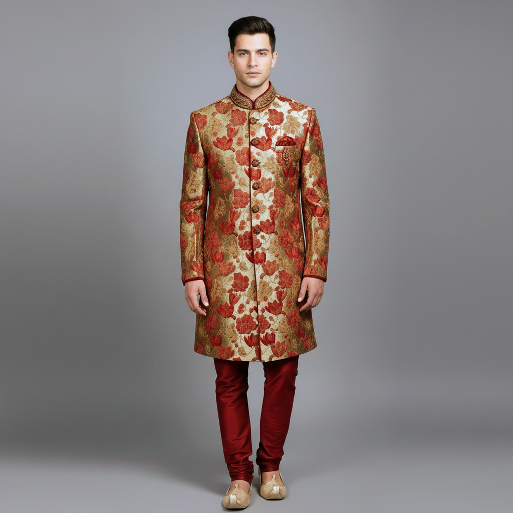 Elevate your wardrobe with this stunning red and gold Indo-Western ensemble from Kuberan Silks. Crafted with meticulous attention to detail, this piece seamlessly blends traditional Indian aesthetics with contemporary silhouettes, making it perfect for weddings, celebrations, or special occasions. The rich red fabric paired with luxurious gold accents creates a sophisticated look that commands attention. Whether you're attending a festive gathering or making a statement at an event, this Indo-Western design offers versatility and timeless elegance. Experience the perfect fusion of heritage and modern style with Kuberan's expertly tailored collection.