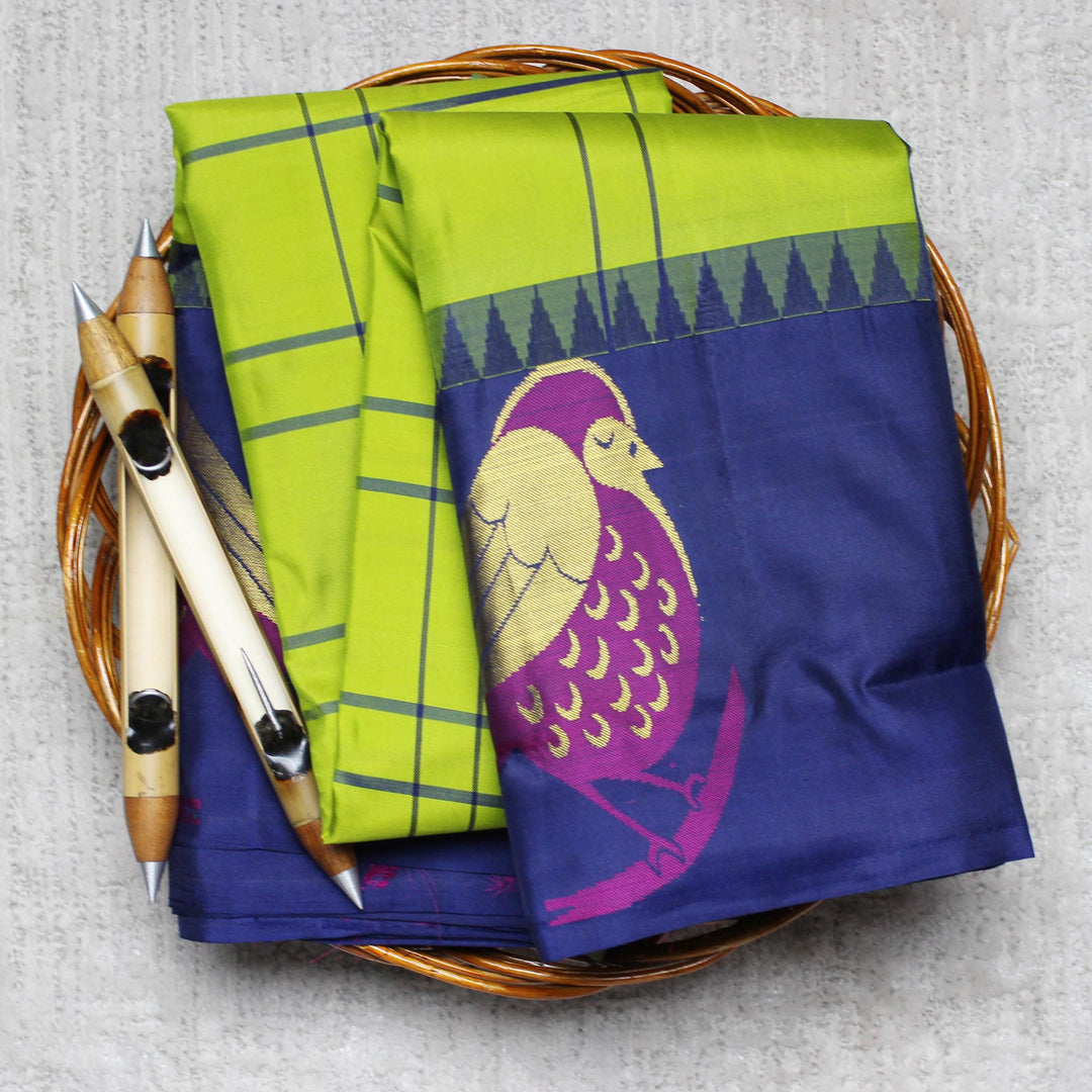 Kuberan Parrot Green With Royal Blue Border Silk Saree