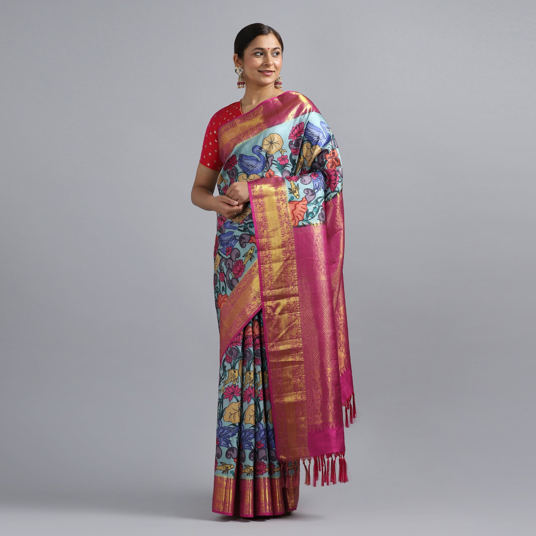 The KUBERAN sky blue kalamkari saree is perfect for formal occasions. This elegant piece has been handcrafted using traditional kalamkari art work, and is sure to make a statement. Look and feel your best in this gorgeous sky blue saree.