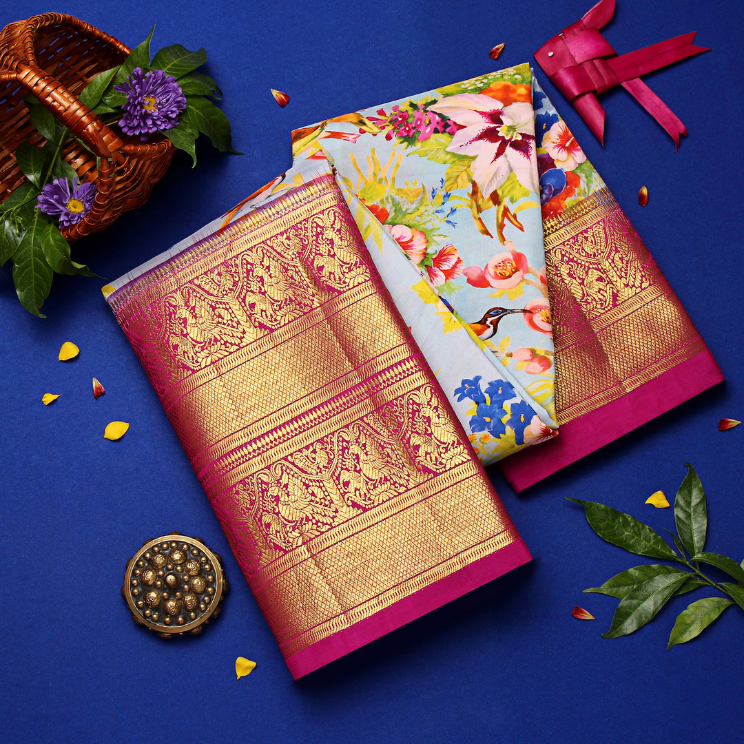 Kuberan Sky Blue Kalamkari Prints Kanchipuram Silk Saree