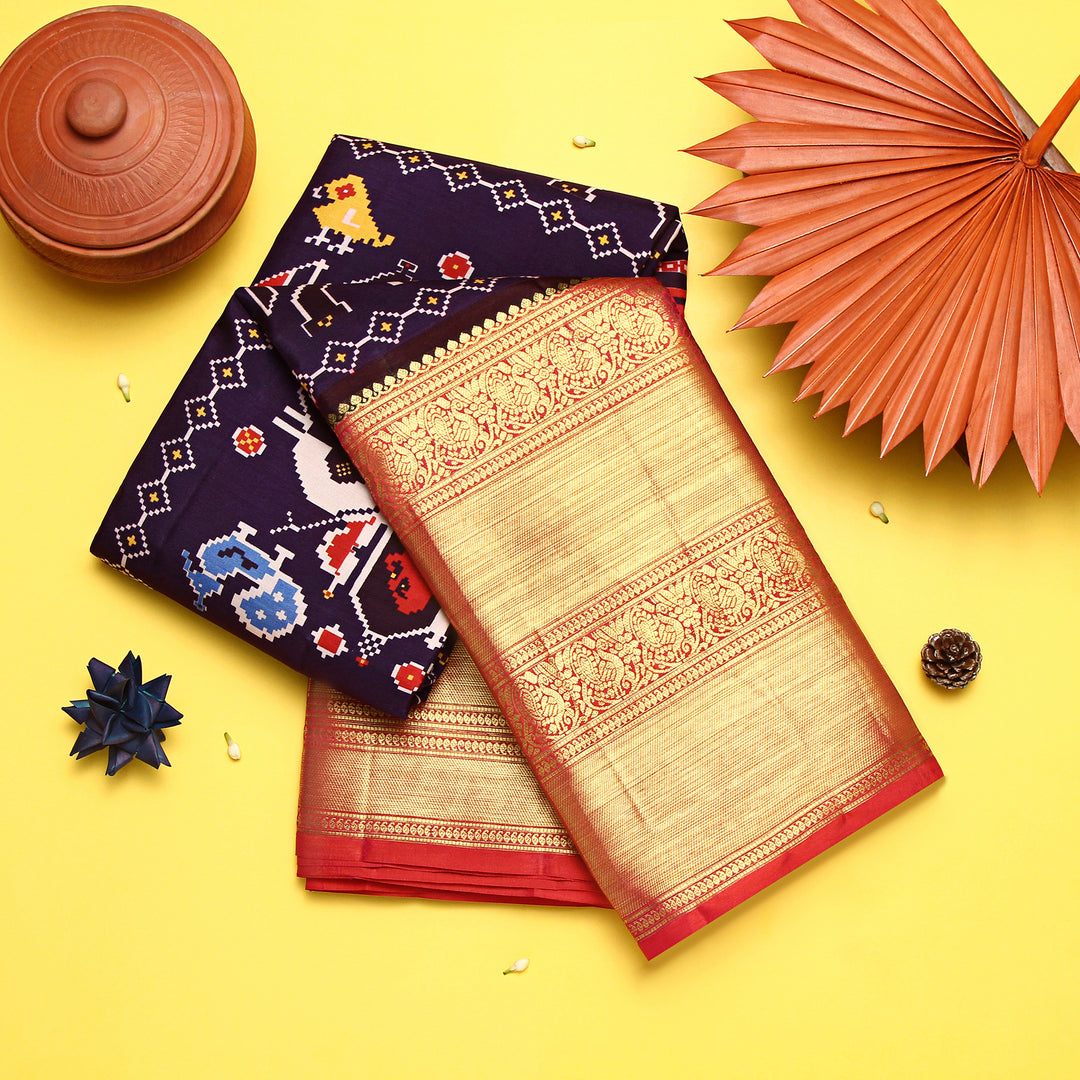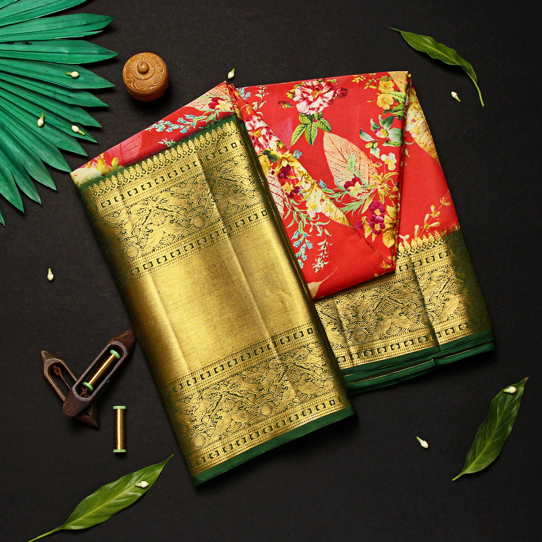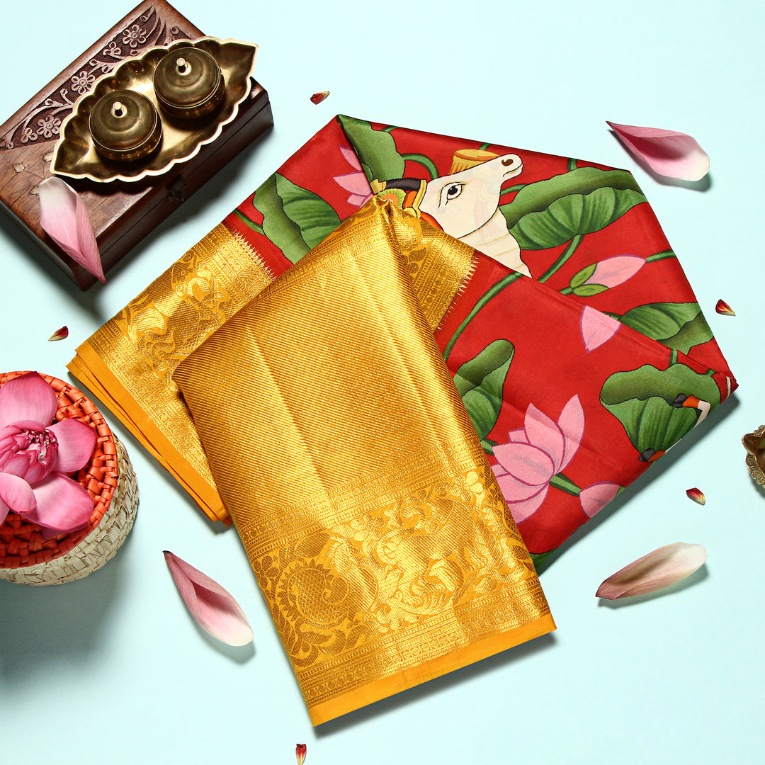 Kuberan Red Kalamkari Prints Kanchipuram Silk Saree