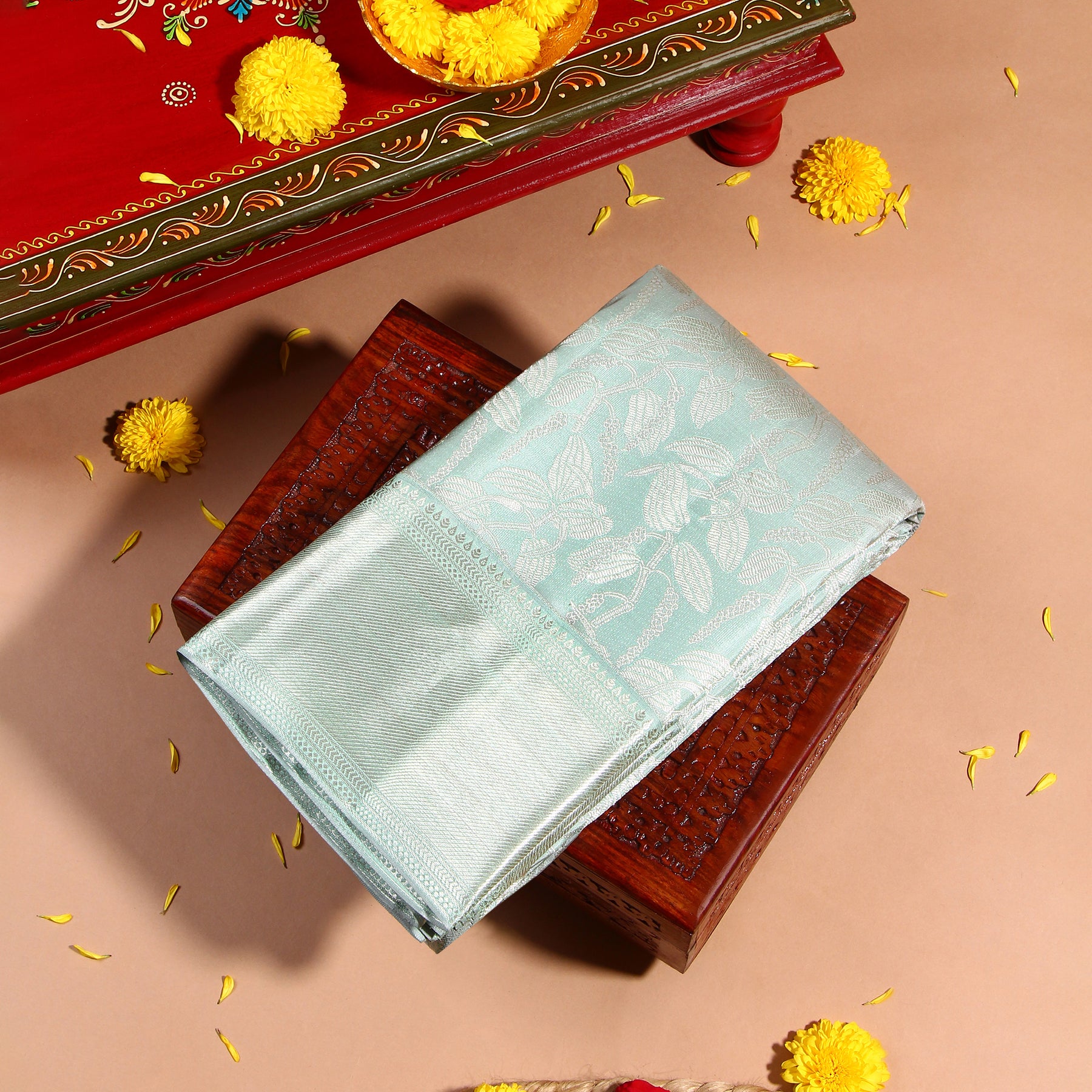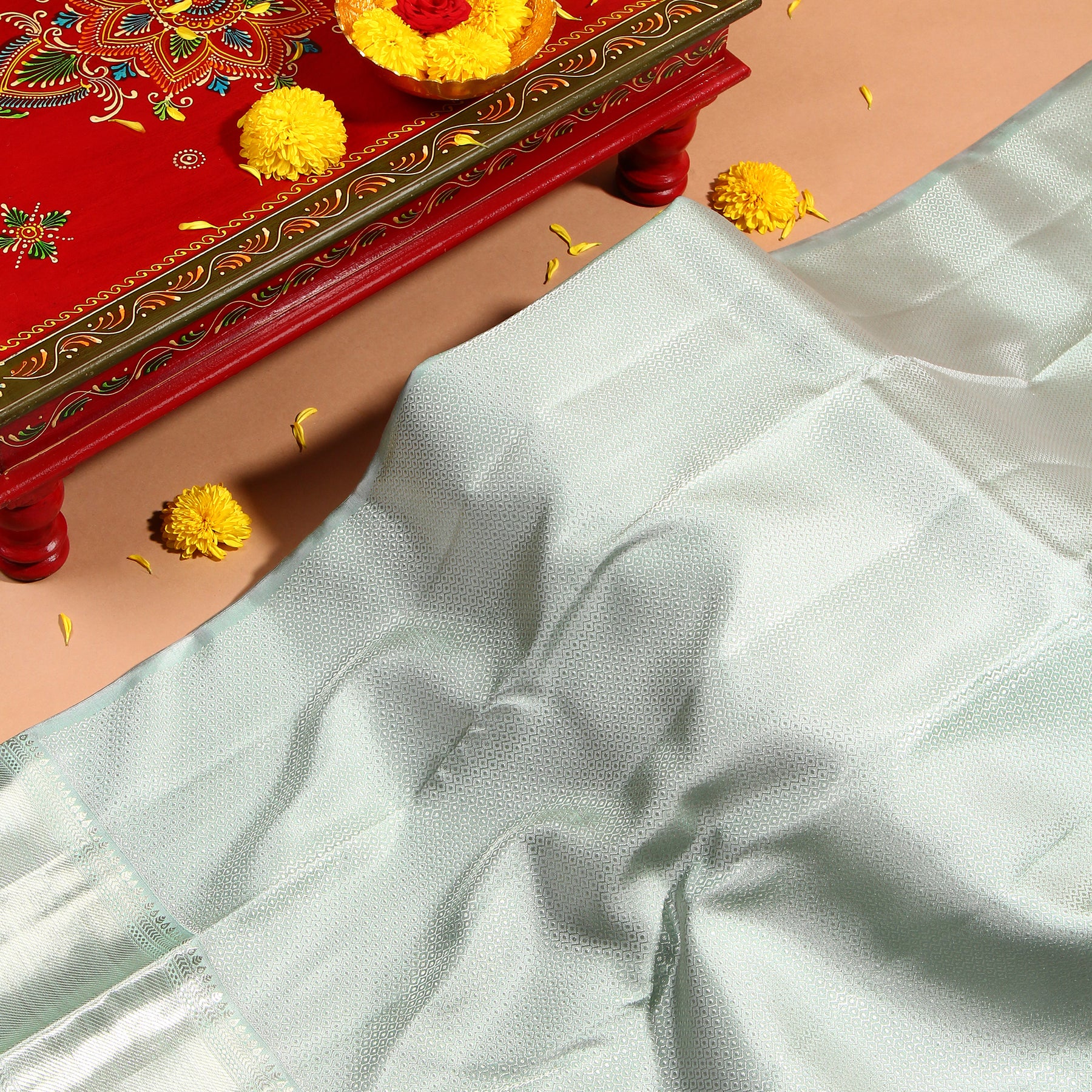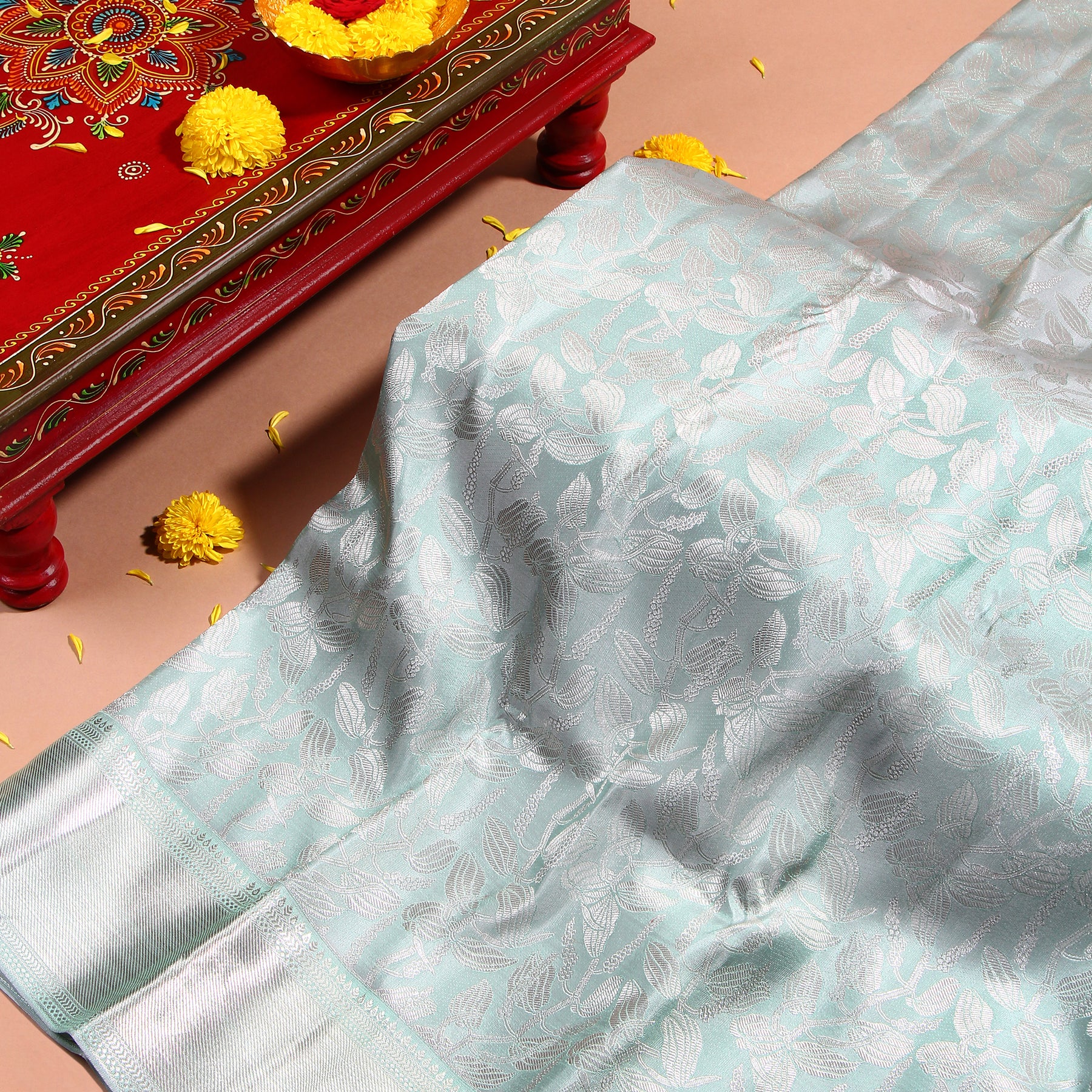 Elevate your wardrobe with our stunning Kuberan Aqua blue Kanchivaram Saree. This saree features exquisite floral silver work, adding a touch of elegance to any occasion. Experience the luxurious feel and eye-catching design of this saree, perfect for showcasing your unique style and adding a touch of beauty to your ensemble. Don't miss out on this must-have piece for any fashion enthusiast!