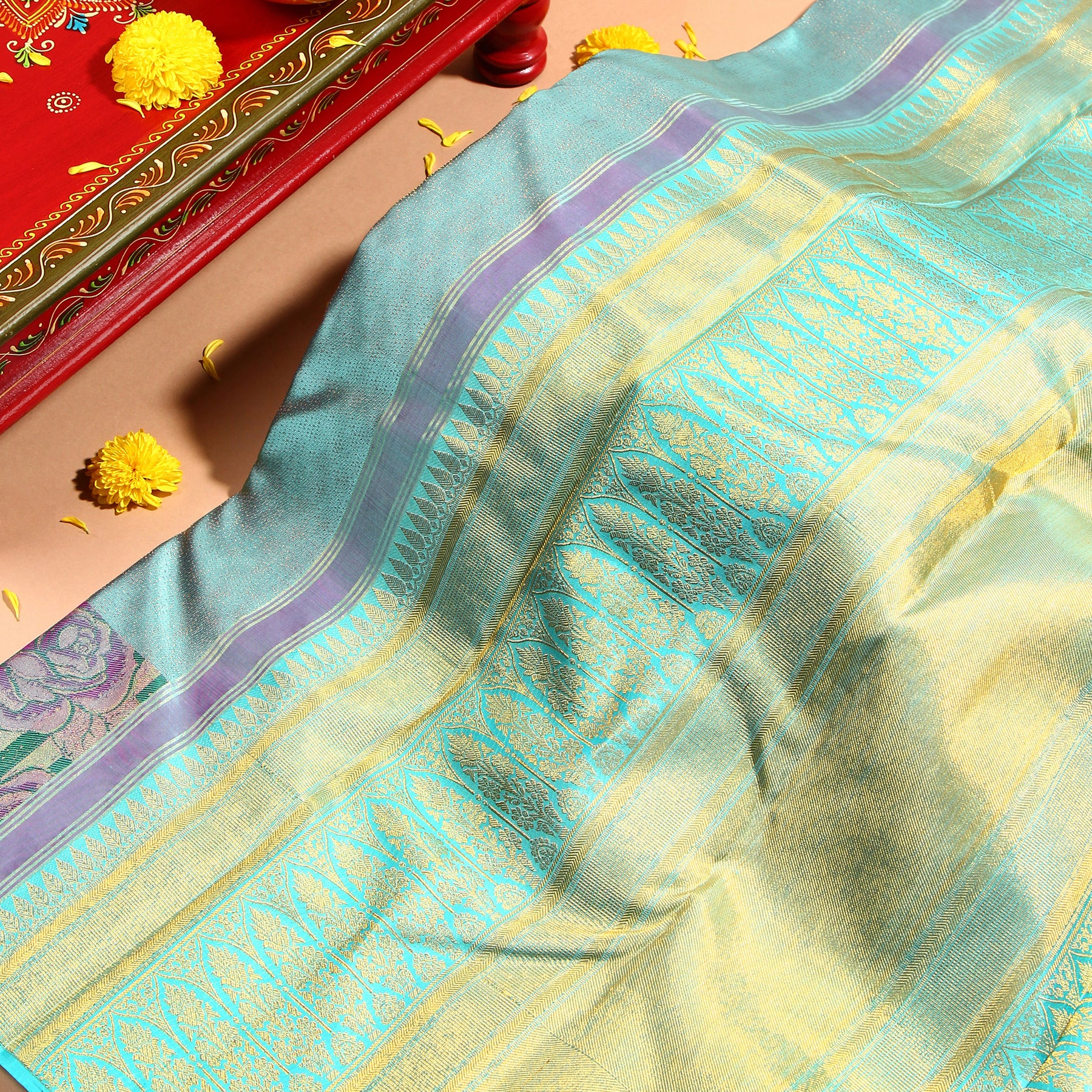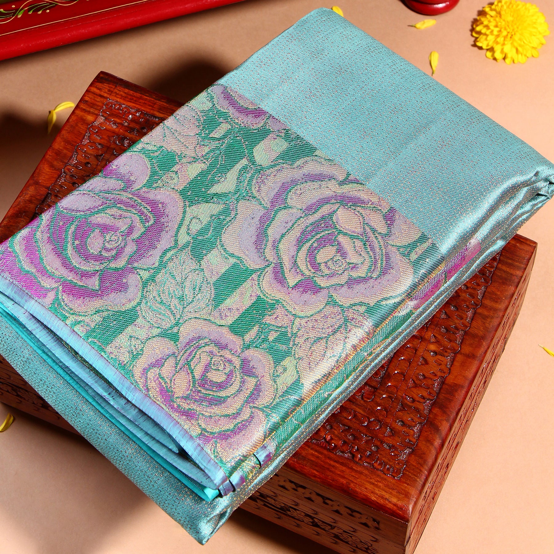 Elevate your look with the stunning Kuberan Coral Blue Kanchivaram Saree. This traditional saree features a beautiful rose border that adds a touch of elegance to its captivating design. Perfect for any occasion, this saree will surely make you stand out and feel confident.