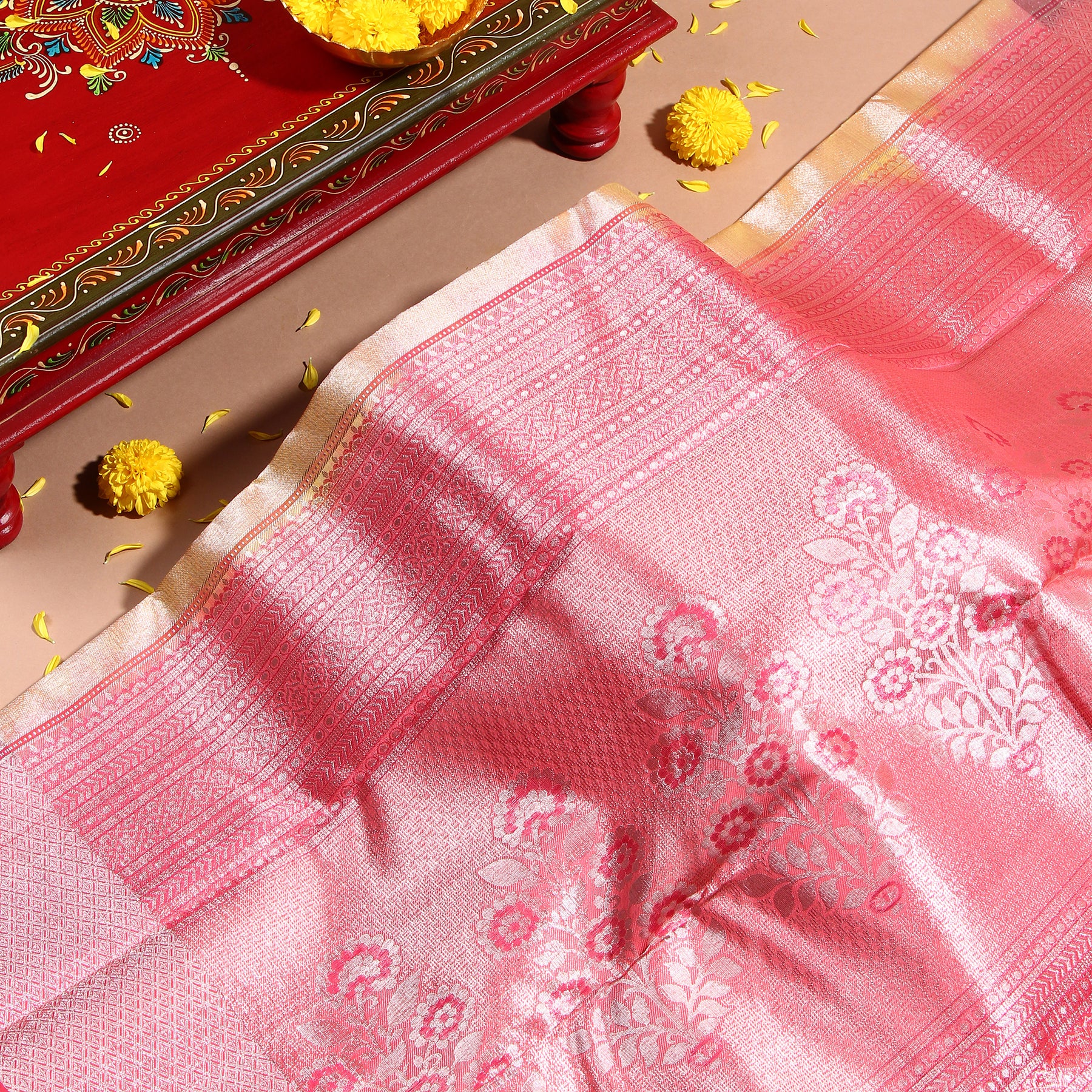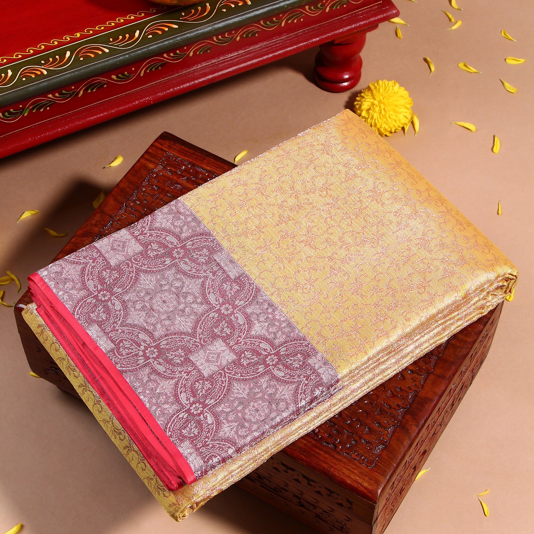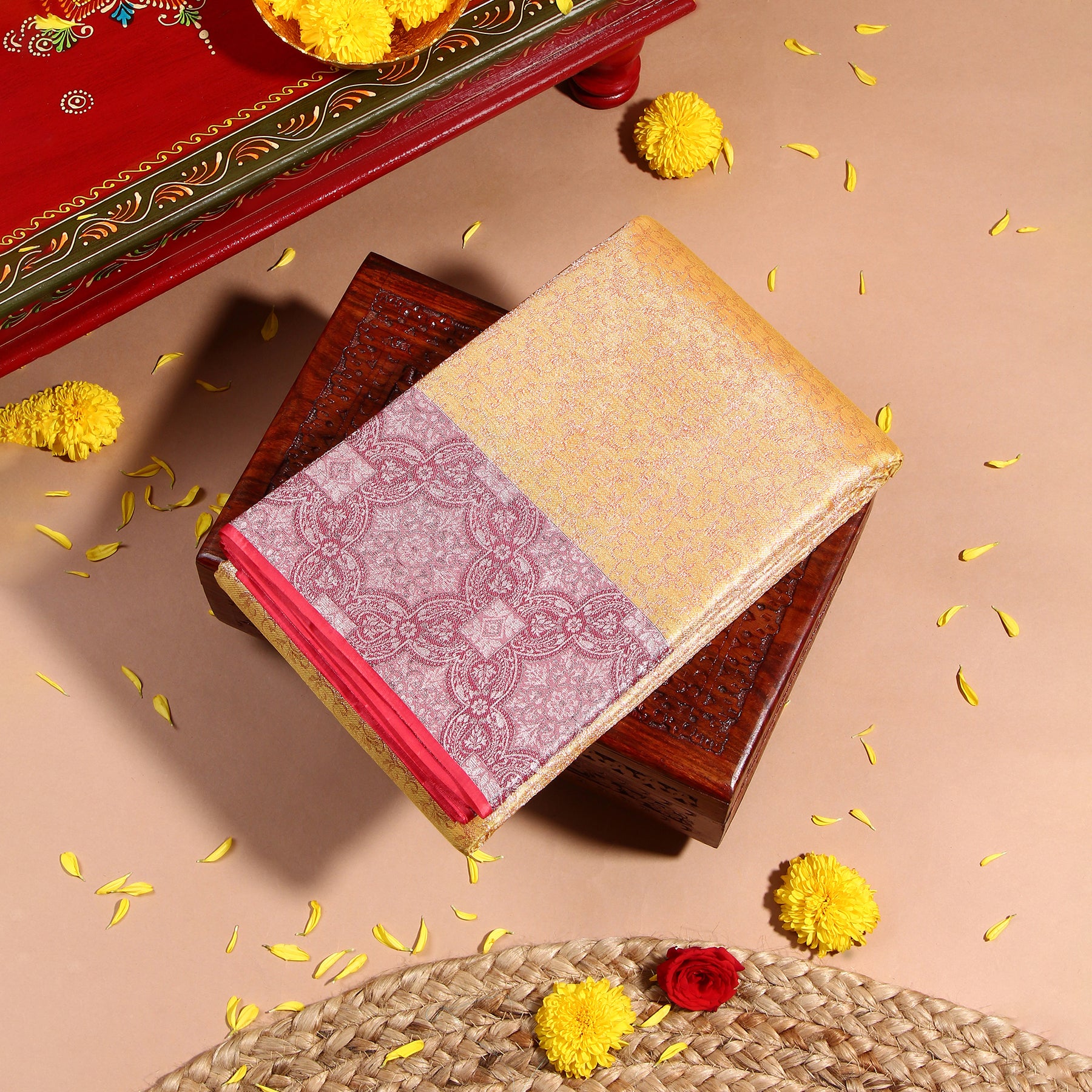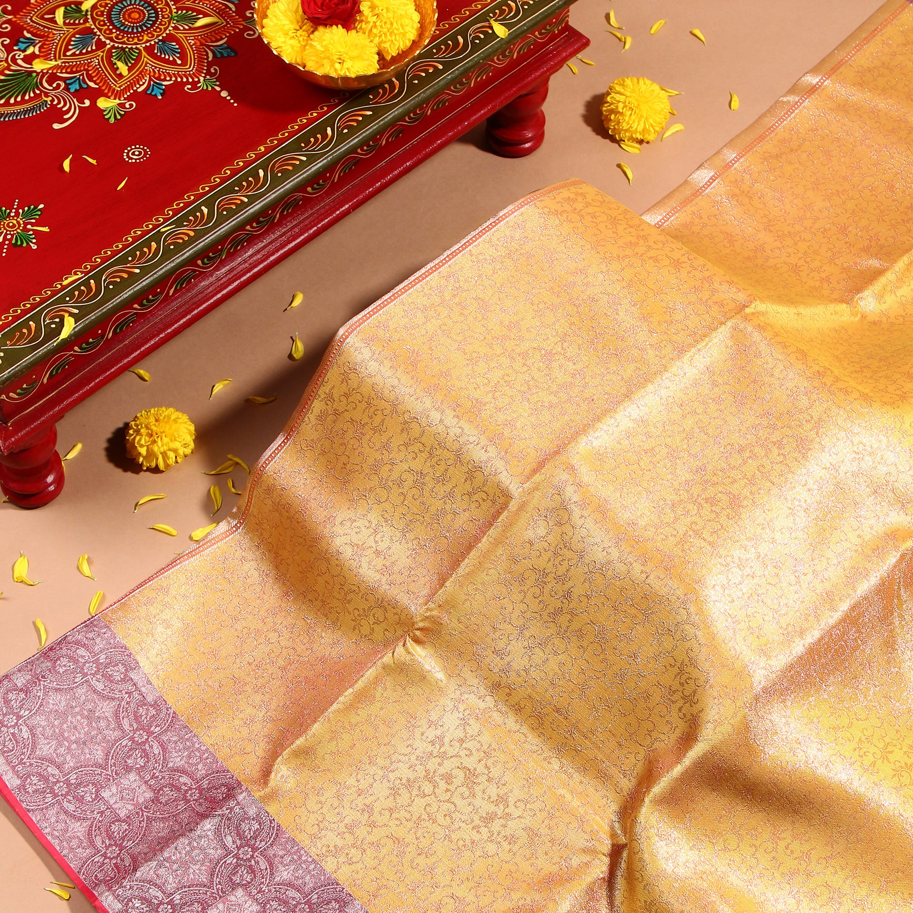 Update your saree collection with our Kuberan gold saree with light purple Kanchivaram. The all-over gold zari work adds elegance while the silver zari unique work on the border makes it stand out. Perfect for special occasions, this saree will make you feel confident and glamorous.