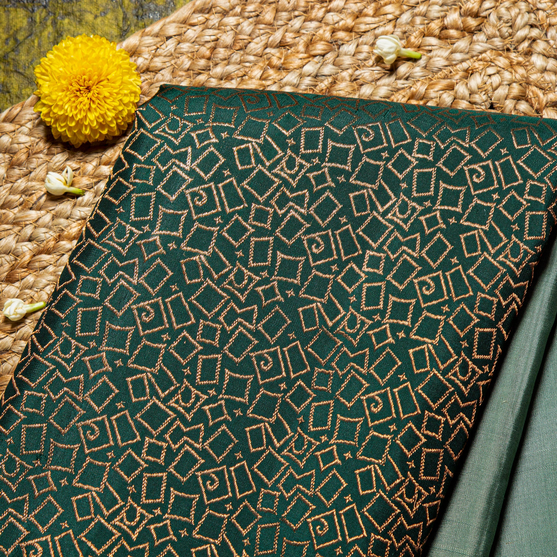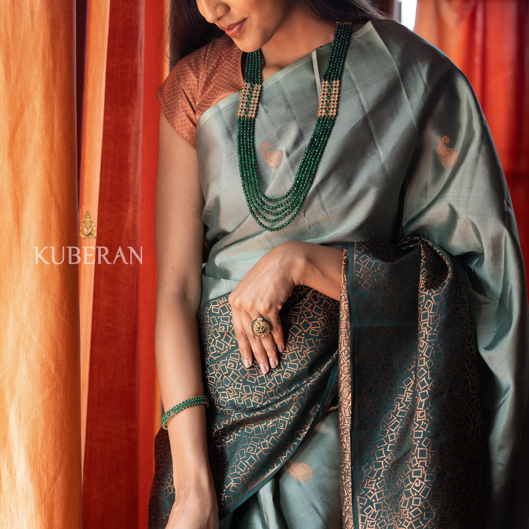 This stunning greyish green KUBERAN KANCHIVARAM SAREE is the perfect addition to your wardrobe! Featuring an elegant designer abstract bottle green border and luxurious silk fabric, this saree is sure to turn heads. Feel graceful and fashionable with this timeless classic.