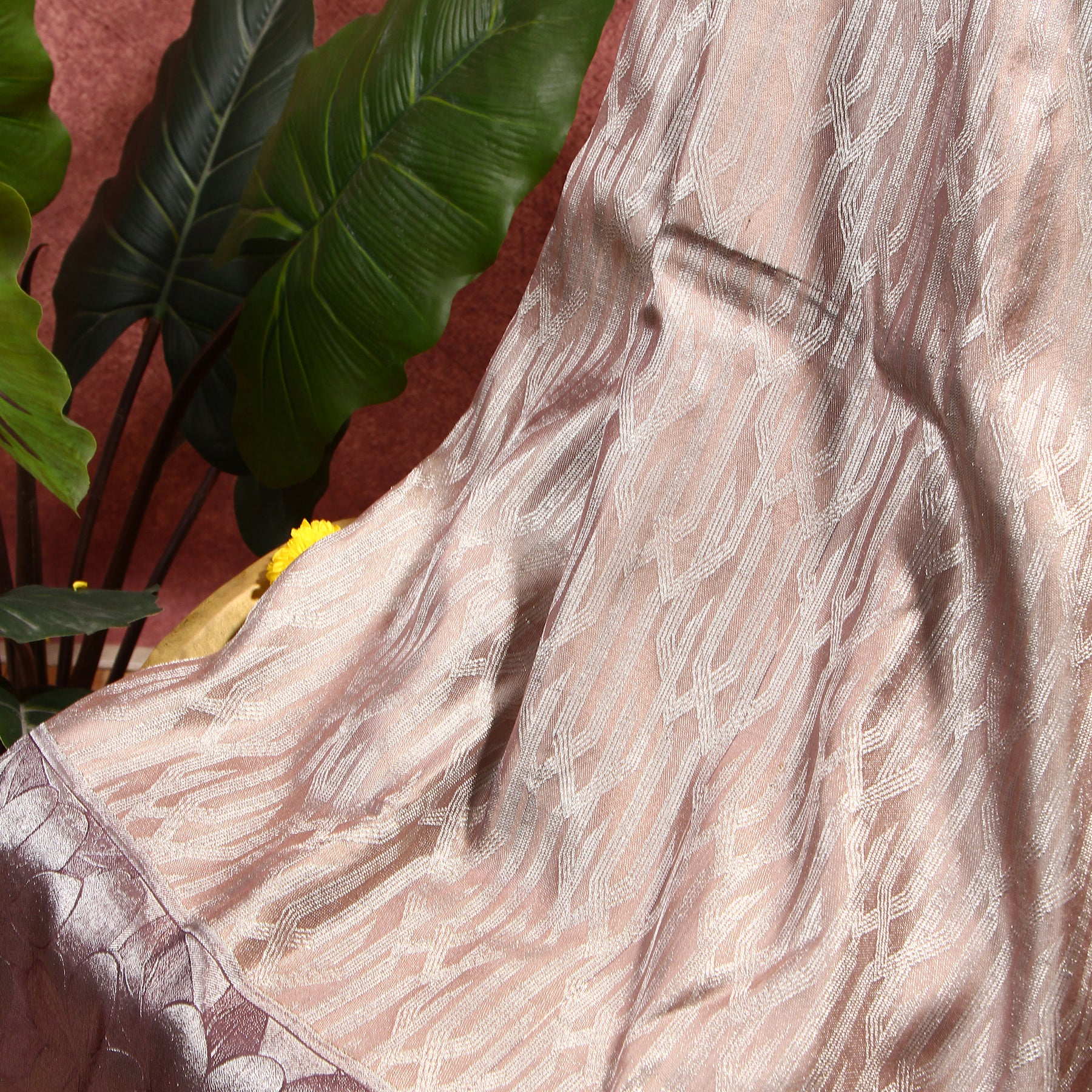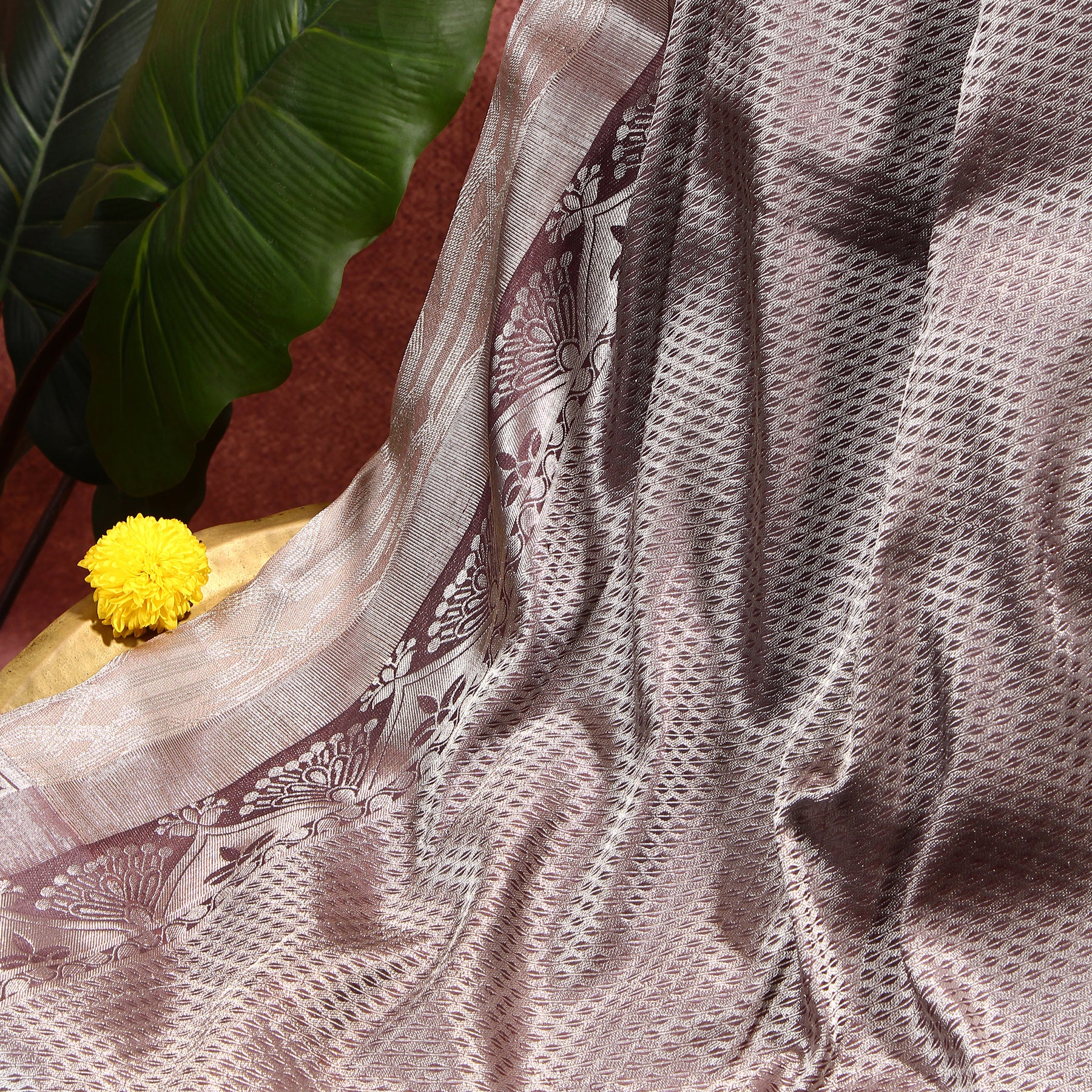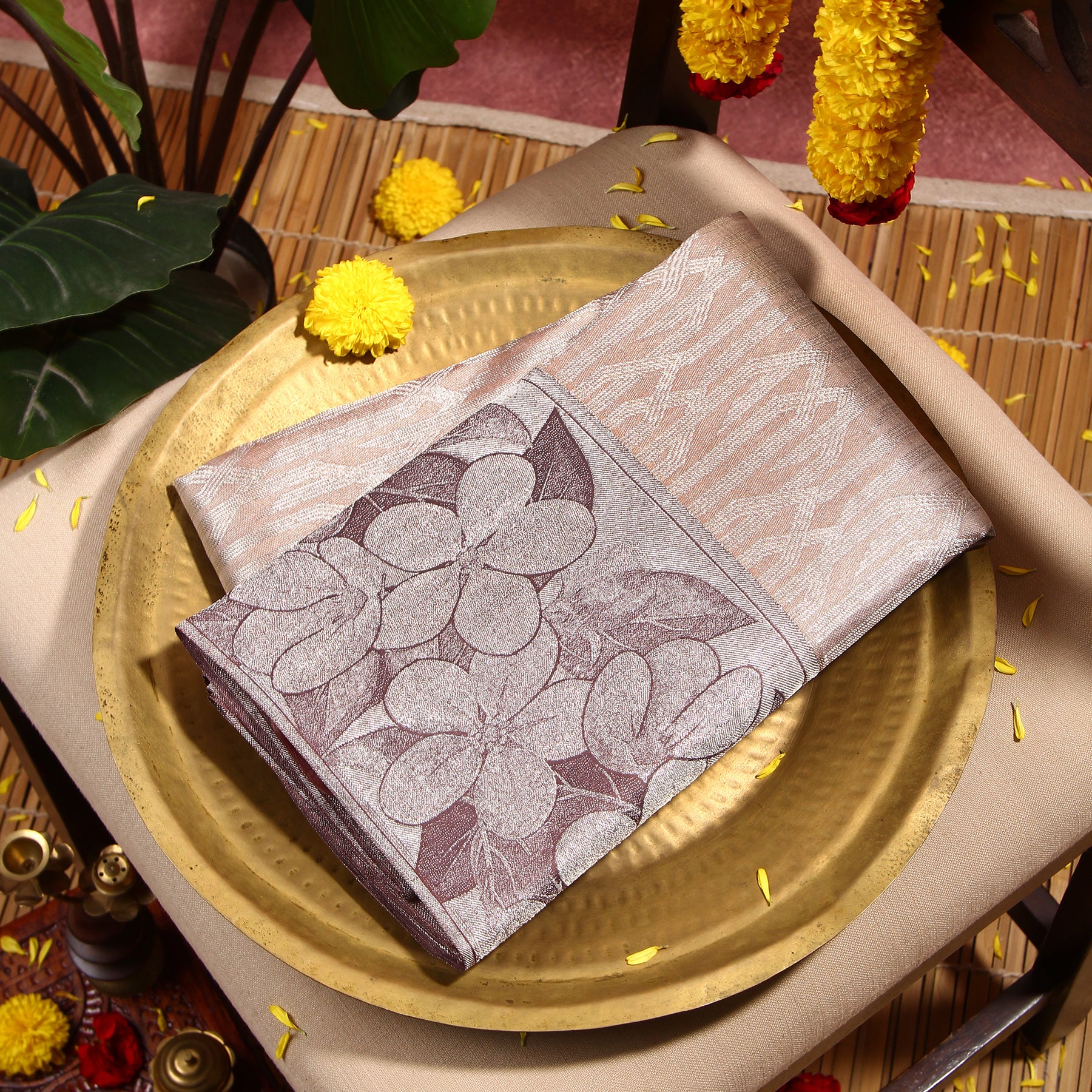 Experience the elegance and royalty of our Kuberan light brown Kanchivaram Saree. Adorned with intricate silver zari work and a designer border, this saree is a true masterpiece. Elevate your fashion game with this luxurious saree and make a statement at any occasion.