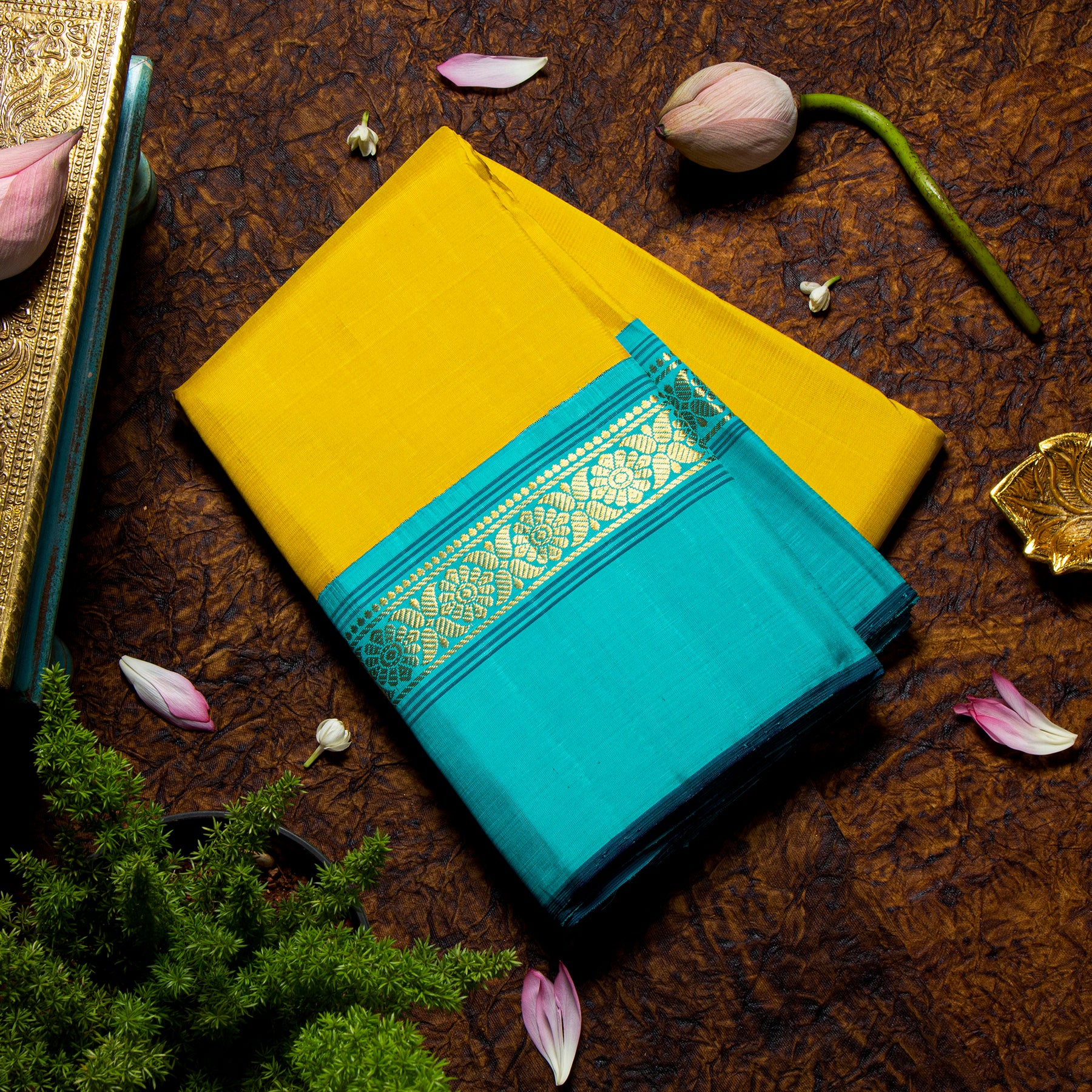 Kuberan Mustard Yellow With  Dark Turquoise Blue Kanchivaram Saree